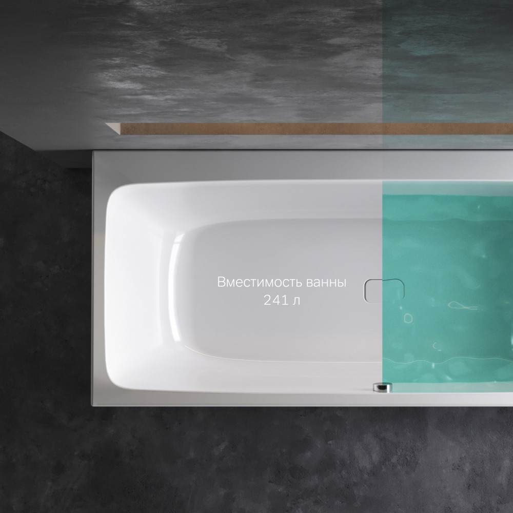 Характерный дизайн: сочетание широкого борта с одной стороны с ультра-тонким бортом с другой стороны создает неповторимую квинтэссенцию стиля. А декоративная заглушка слива повторяющая форму самой ванны станет яркой деталью в интерьере.