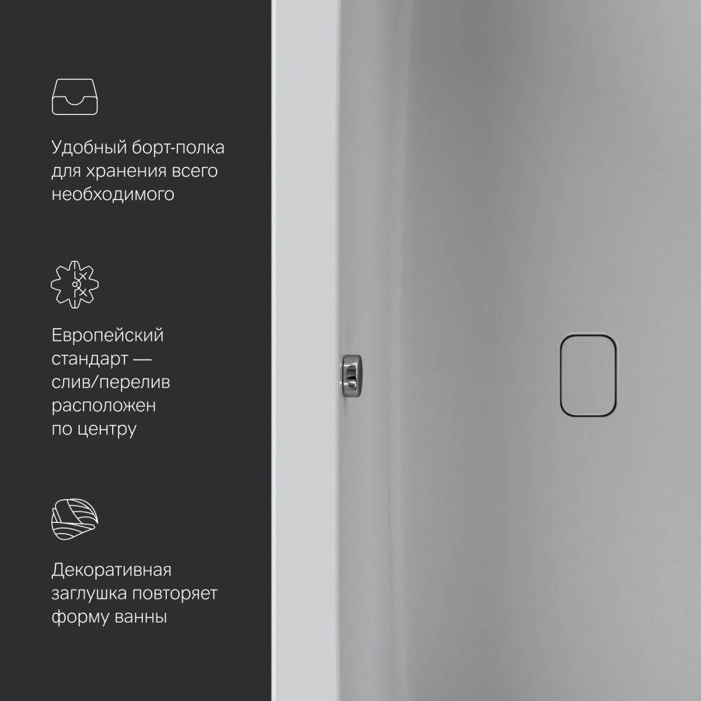 Характерный дизайн: сочетание широкого борта с одной стороны с ультра-тонким бортом с другой стороны создает неповторимую квинтэссенцию стиля. А декоративная заглушка слива повторяющая форму самой ванны станет яркой деталью в интерьере.
