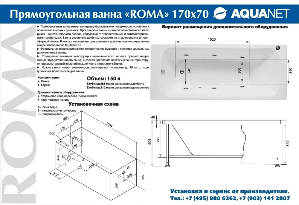 Акриловая ванна Aquanet Roma 00205375 170x70 с каркасом