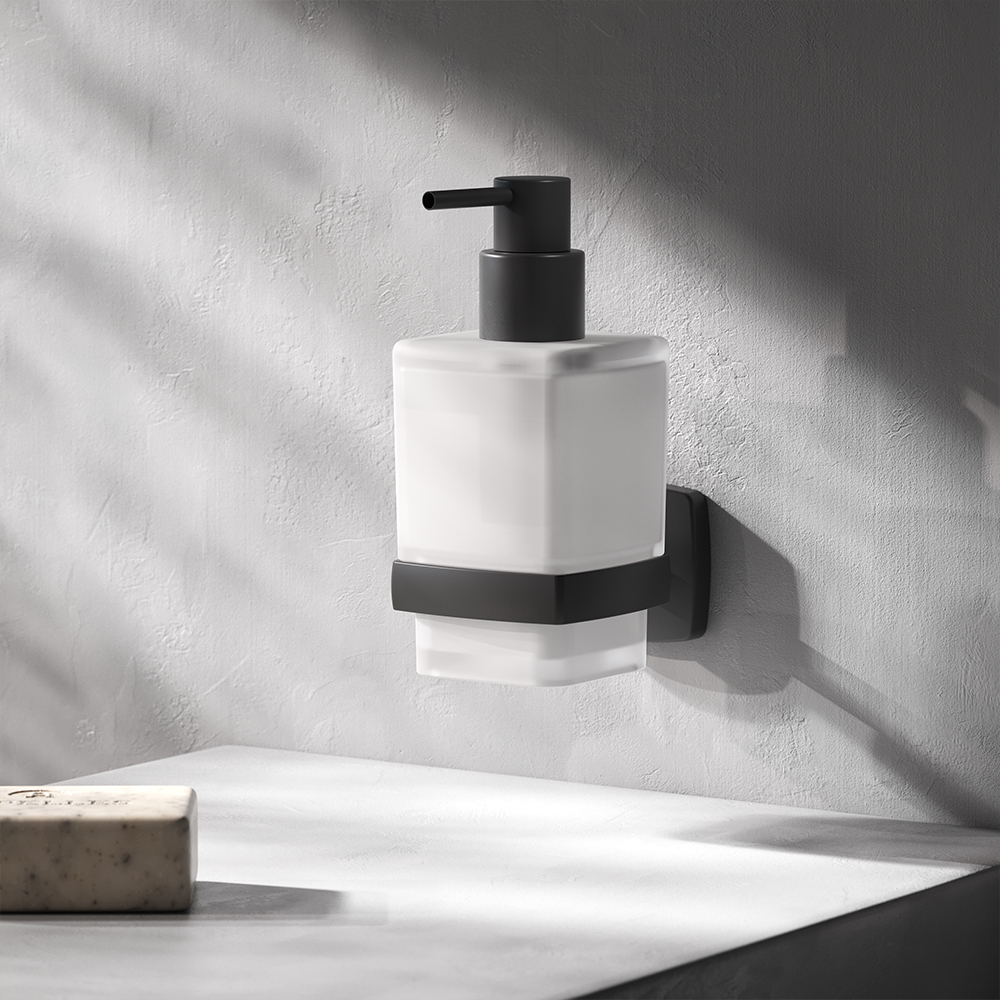 Форма аксессуаров Gem повторяет линии смесителей коллекции подчеркивая единую концепцию дизайна. Диспенсер для мыла изготовлен из цинка и закаленного матового стекла. Лазерная обработка стыков гарантирует ультратонкий шов и 100% защиту от влаги. Матовая поверхность предотвращает появление следов от капель воды сохраняя поверхность чистой на много дольше.