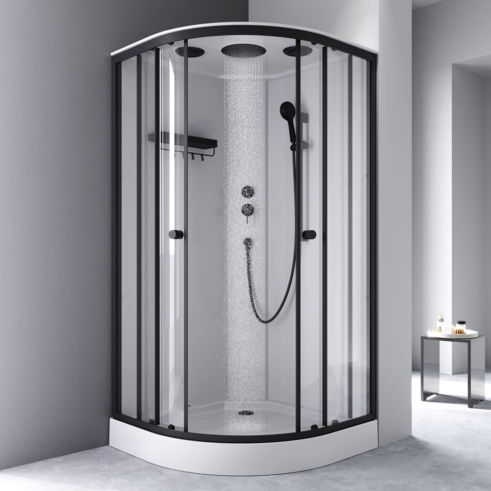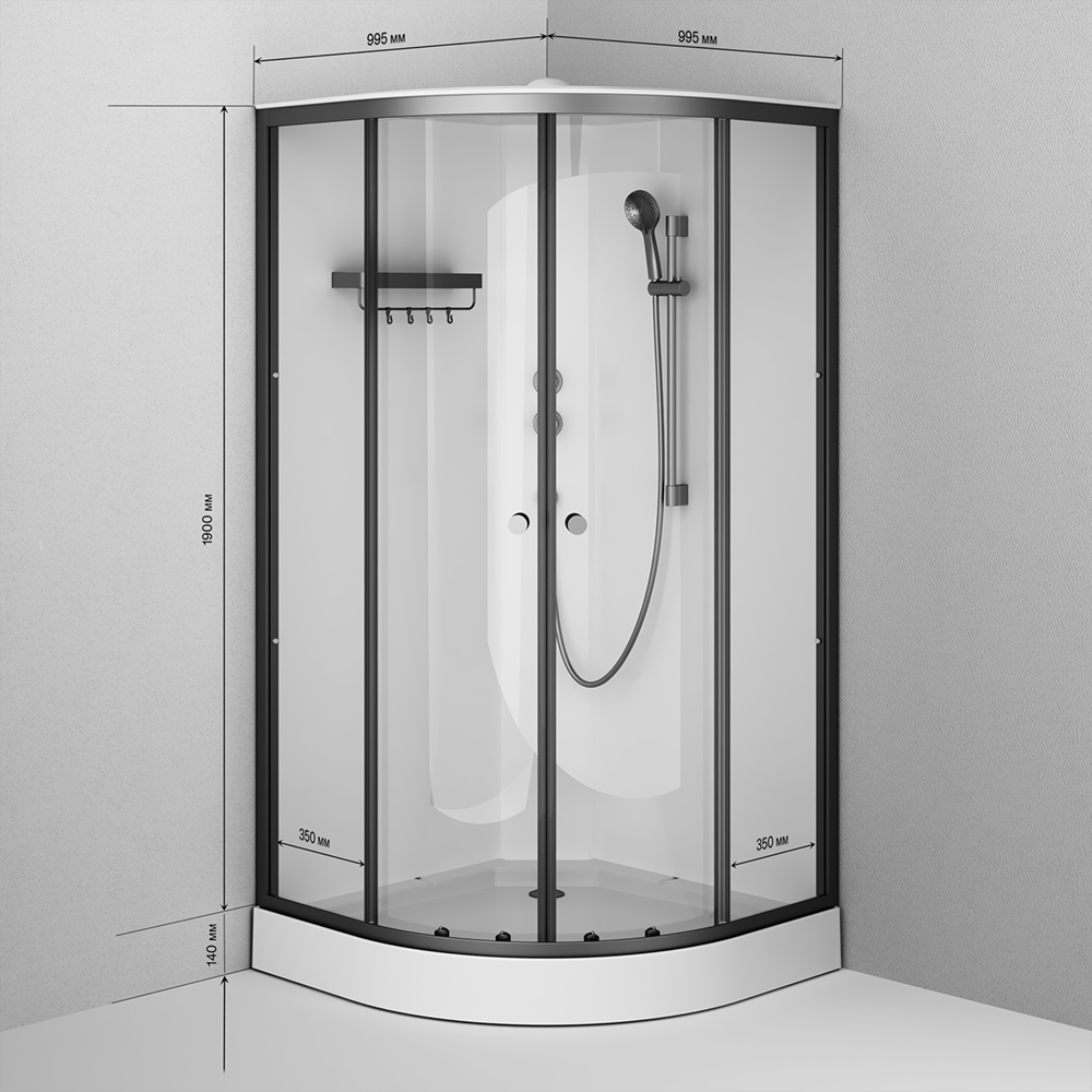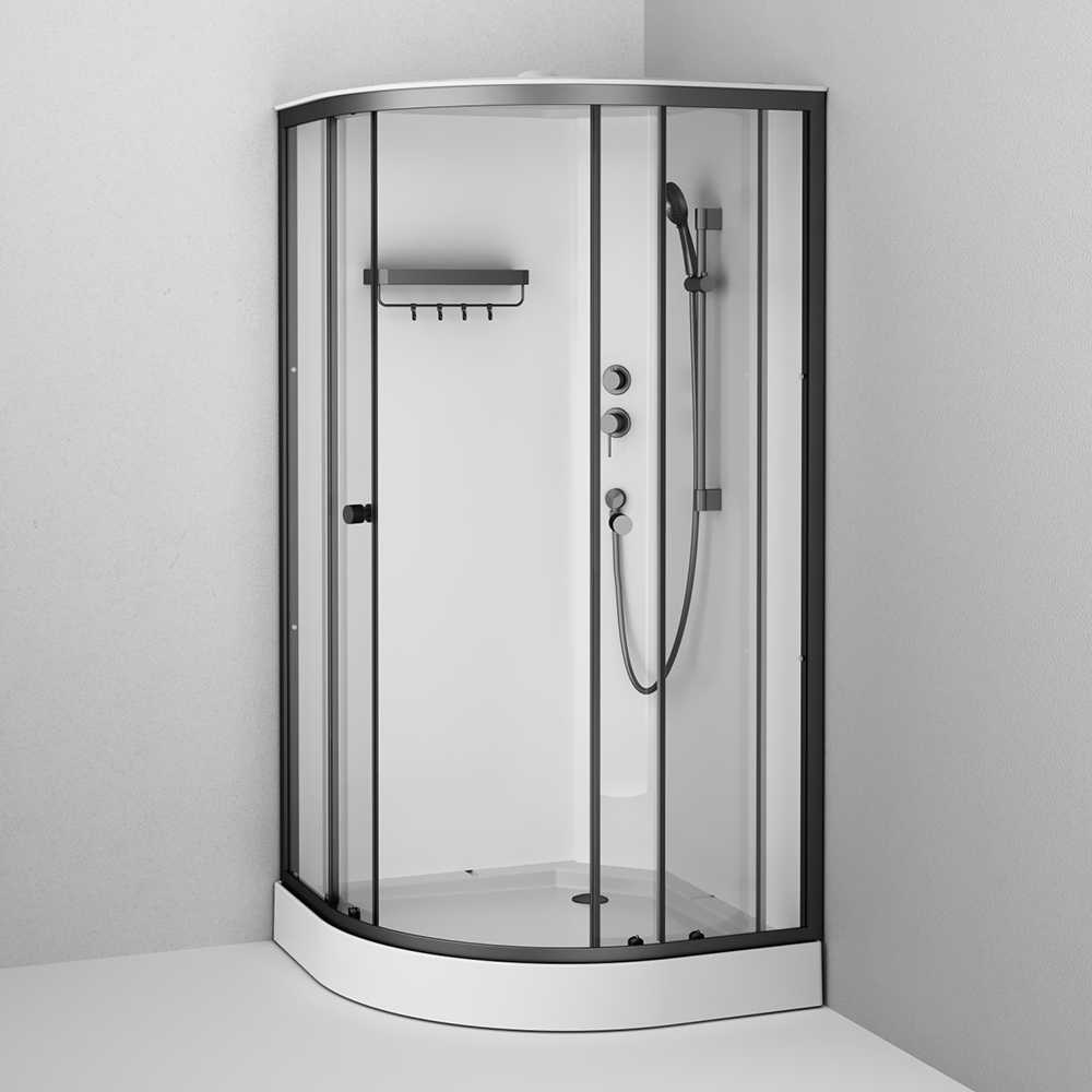 | Оснащение | душевая кабина / сифон / душевой гарнитур / верхний душ / каркас / экран / крючки / полка |