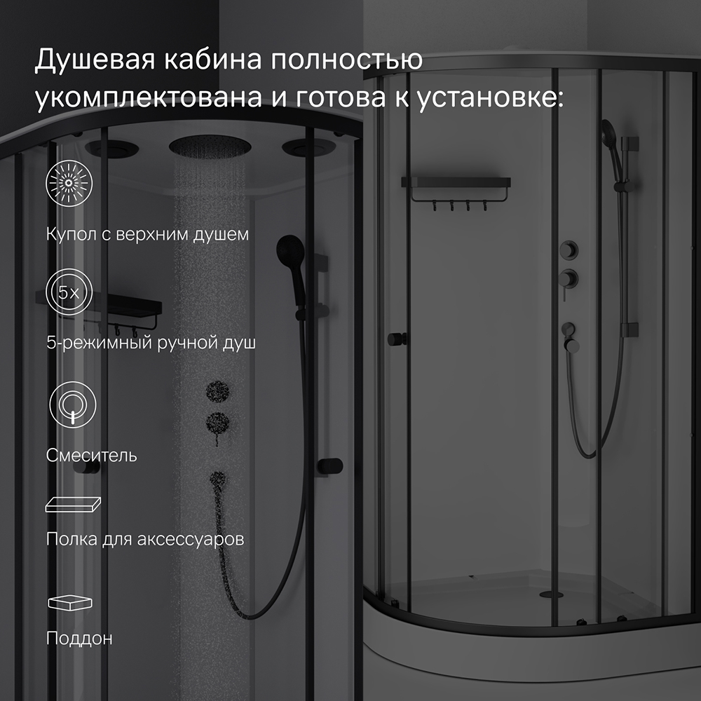 Комплект поставки: душевая кабина, сифон, душевой гарнитур, верхний душ, каркас, экран, крючки, полка.