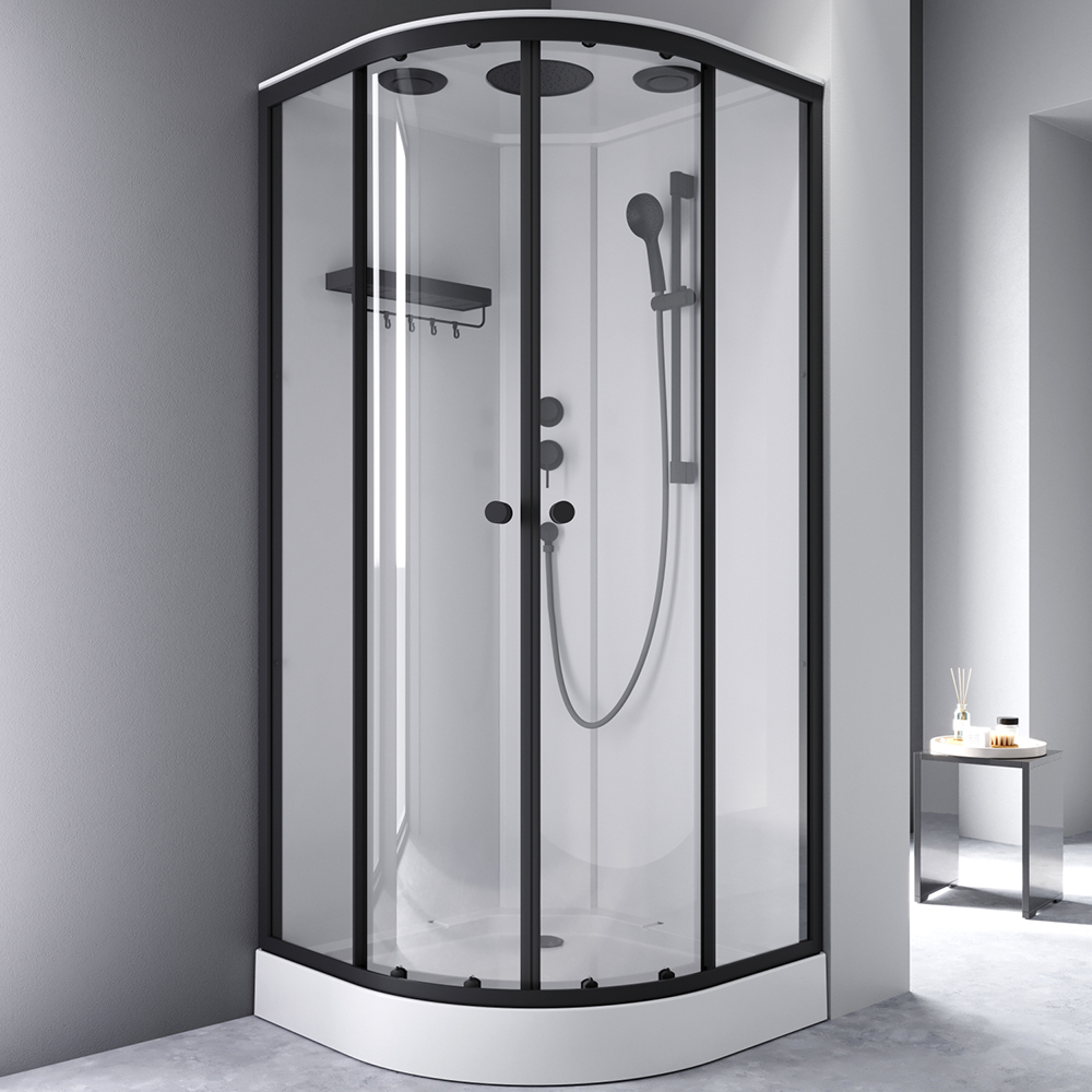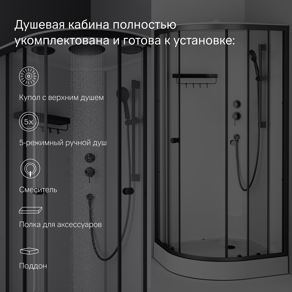 Комплект поставки: душевая кабина, сифон, душевой гарнитур, верхний душ, каркас, экран, крючки, полка.