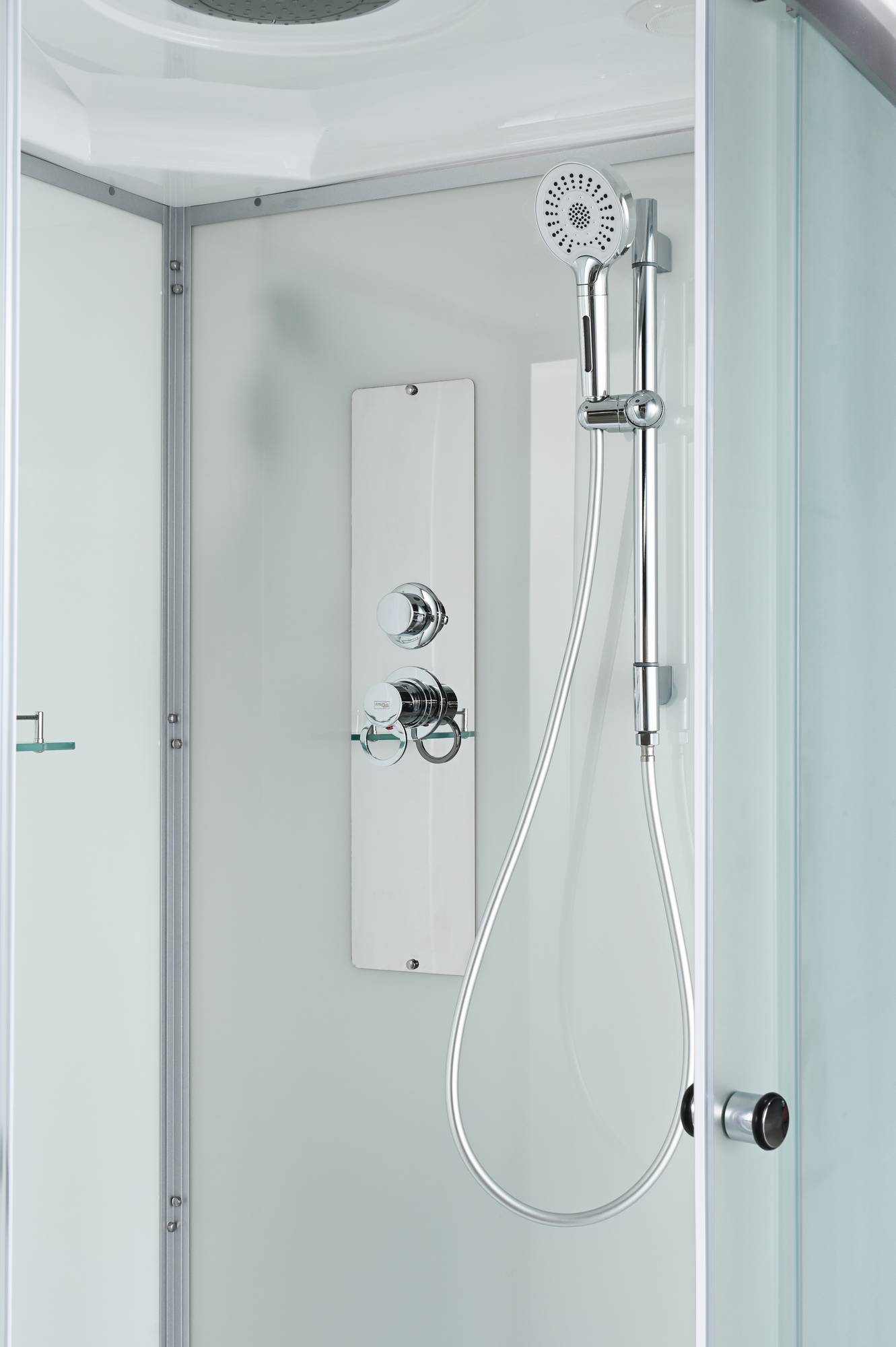 Комплект поставки: душевая кабина, переключатель режимов, полочка, сифон, резьбовой смеситель, тропический (верхний) душ, арома-лейка с витамином C, душевая штанга