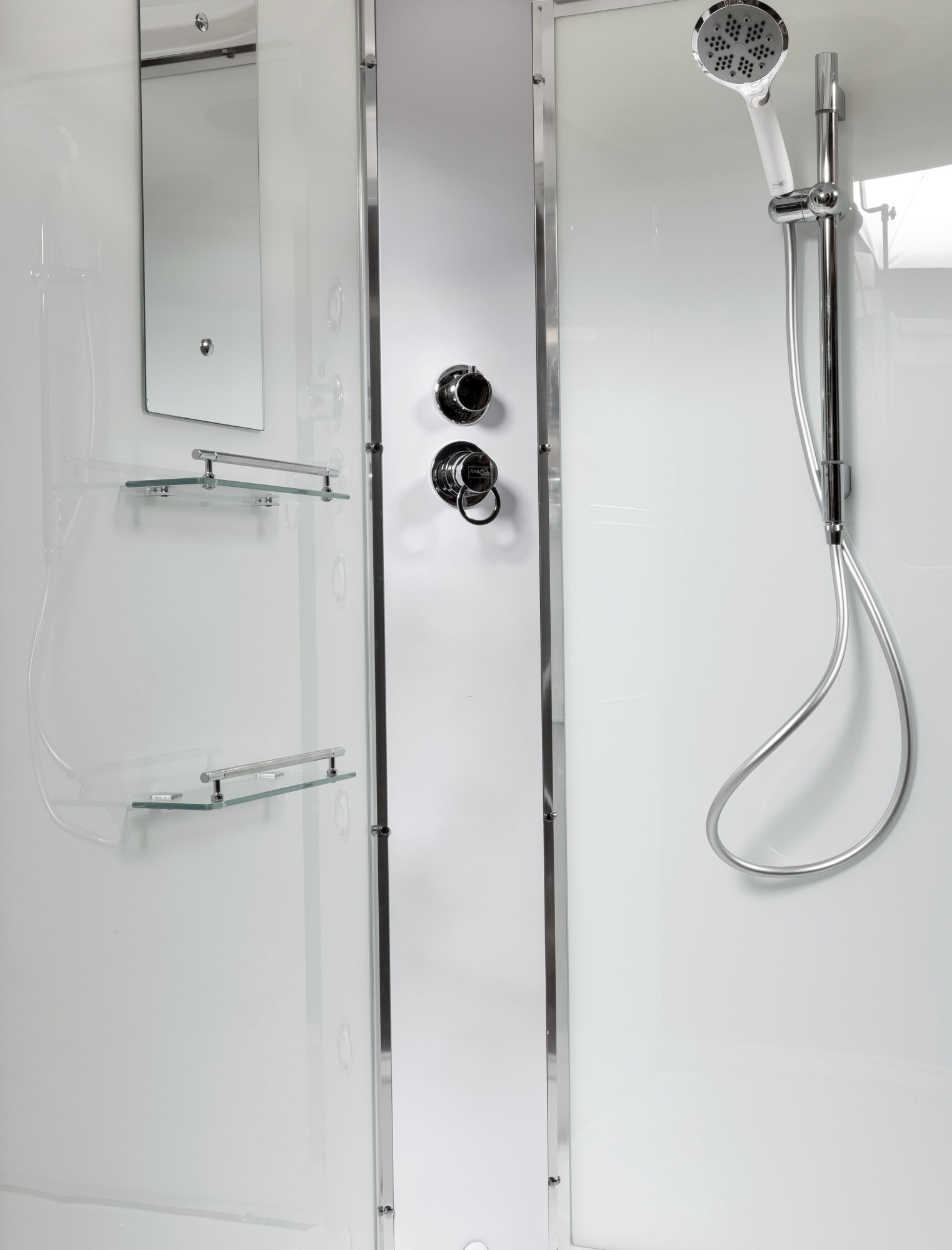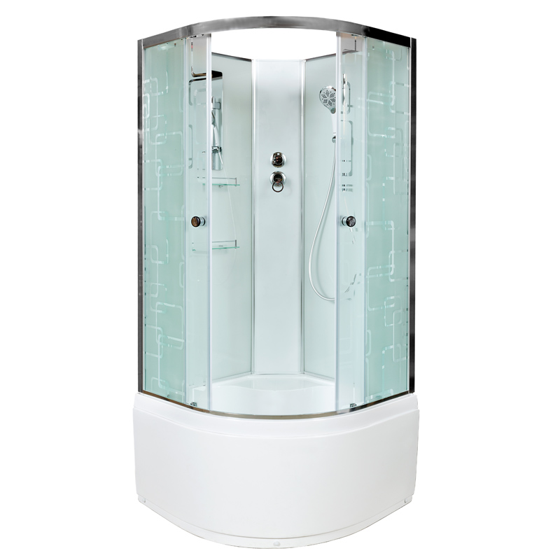 Комплект поставки: душевая кабина, душевой гарнитур, зеркало, переключатель режимов, полочки, смеситель