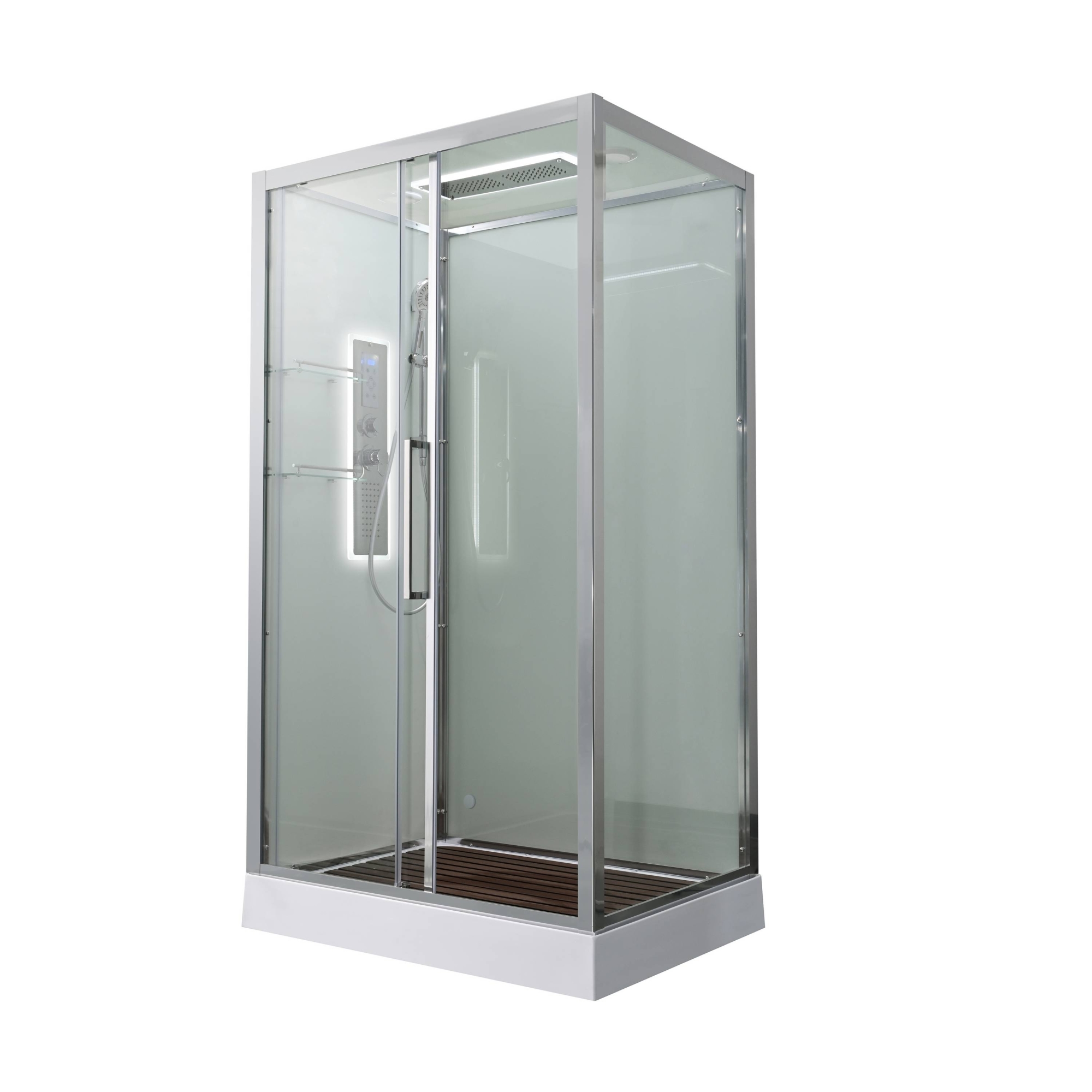 Комплект поставки: душевая кабина, блютуз, led подсветка, радио, вытяжка, гидромассаж спины, сифон, переключатель режимов, полочки, резьбовой смеситель, тропический (верхний) душ, ручки дверей из нержавейки, арома-лейка с витамином C, душевая штанга