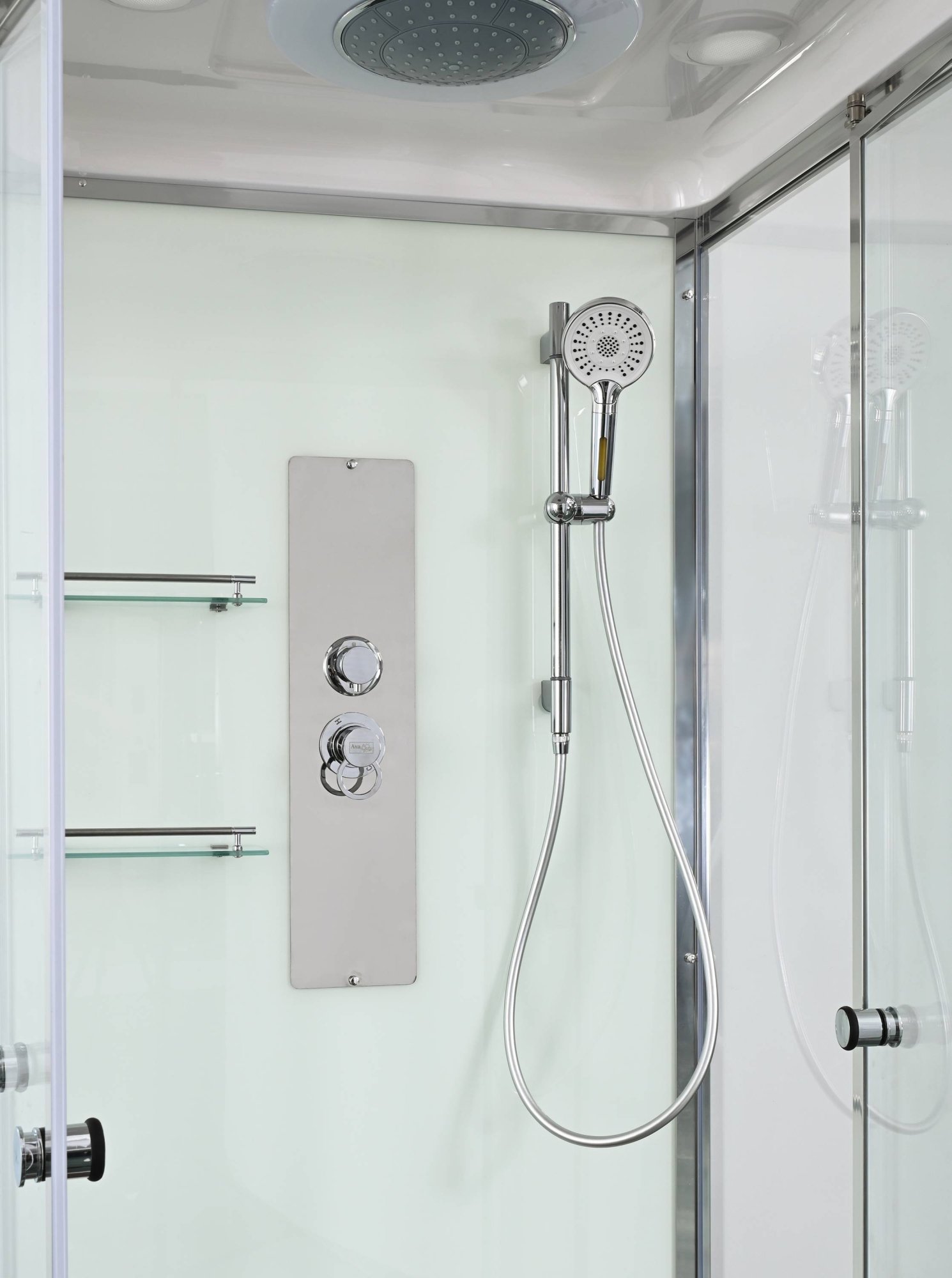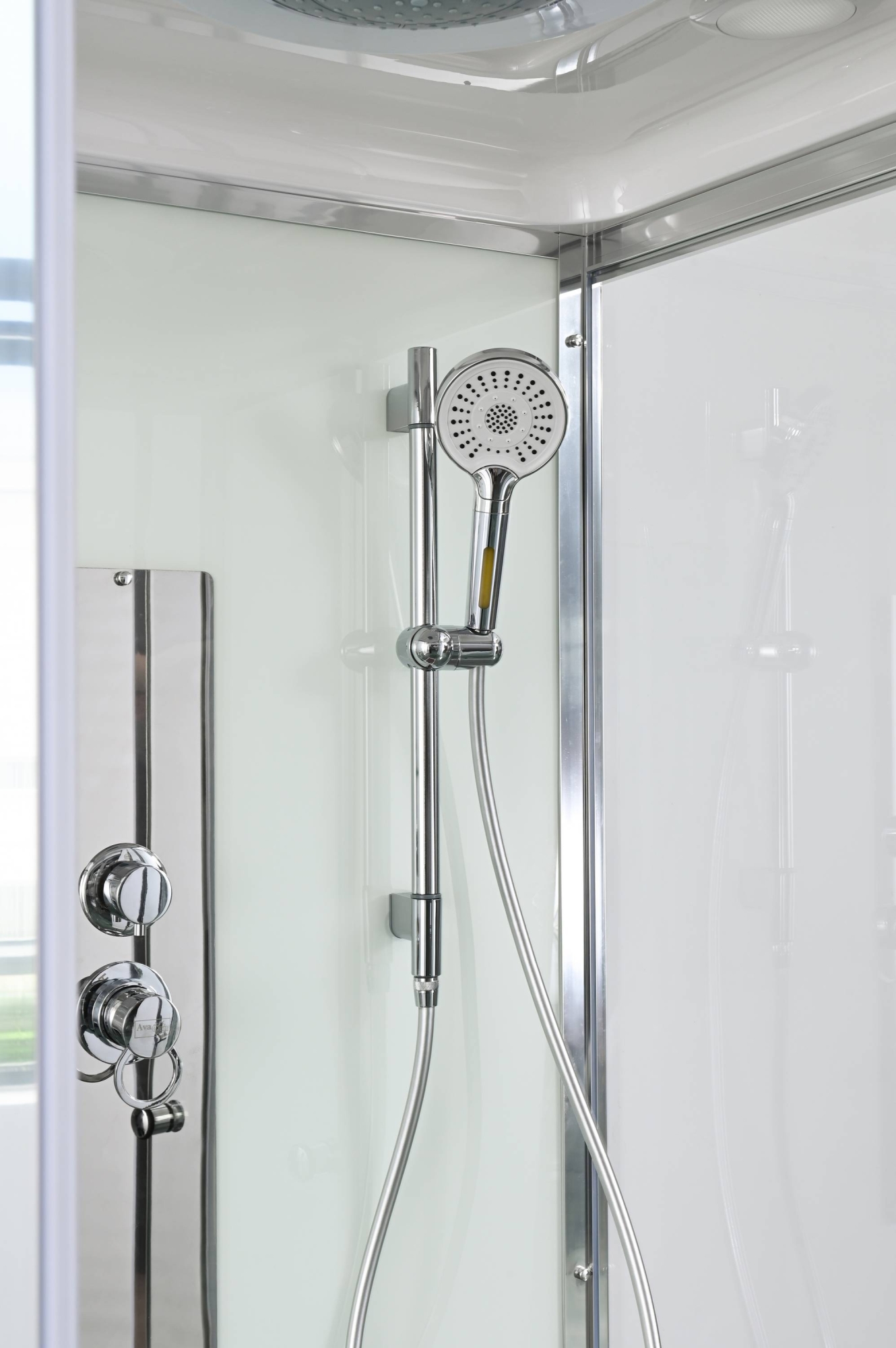 | Оснащение | душевая кабина / полимерная вставка в поддон (имитация дерева) / сифон / переключатель режимов / полочки / резьбовой смеситель / тропический (верхний) душ / ручки дверей / арома-лейка с витамином C / душевая штанга |