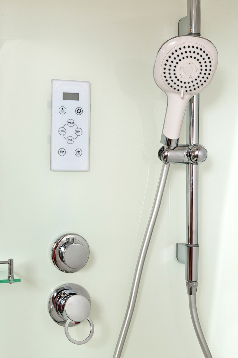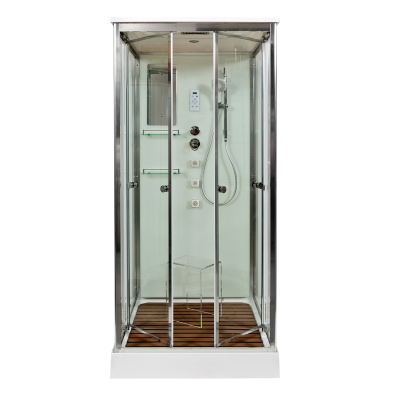 Комплект поставки: душевая кабина, вентиляция, гидромассажные форсунки, душевой гарнитур, зеркало, откидное сиденье, передний съемный экран, переключатель режимов, полочки, радио, сенсорный пульт управления, смеситель, тропический (верхний) душ, деревянная вставка в поддон