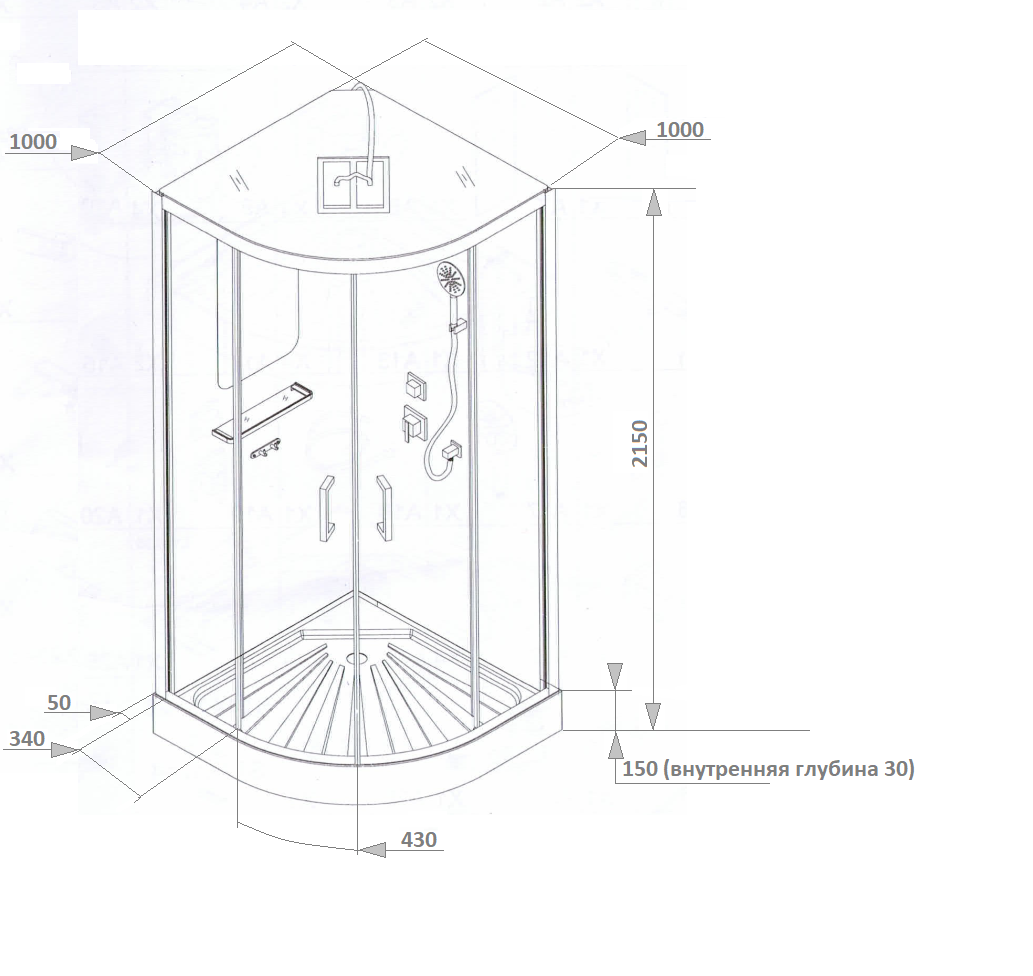 | Оснащение | сифон / полки / антискользящее покрытие ванны / верхний душ |