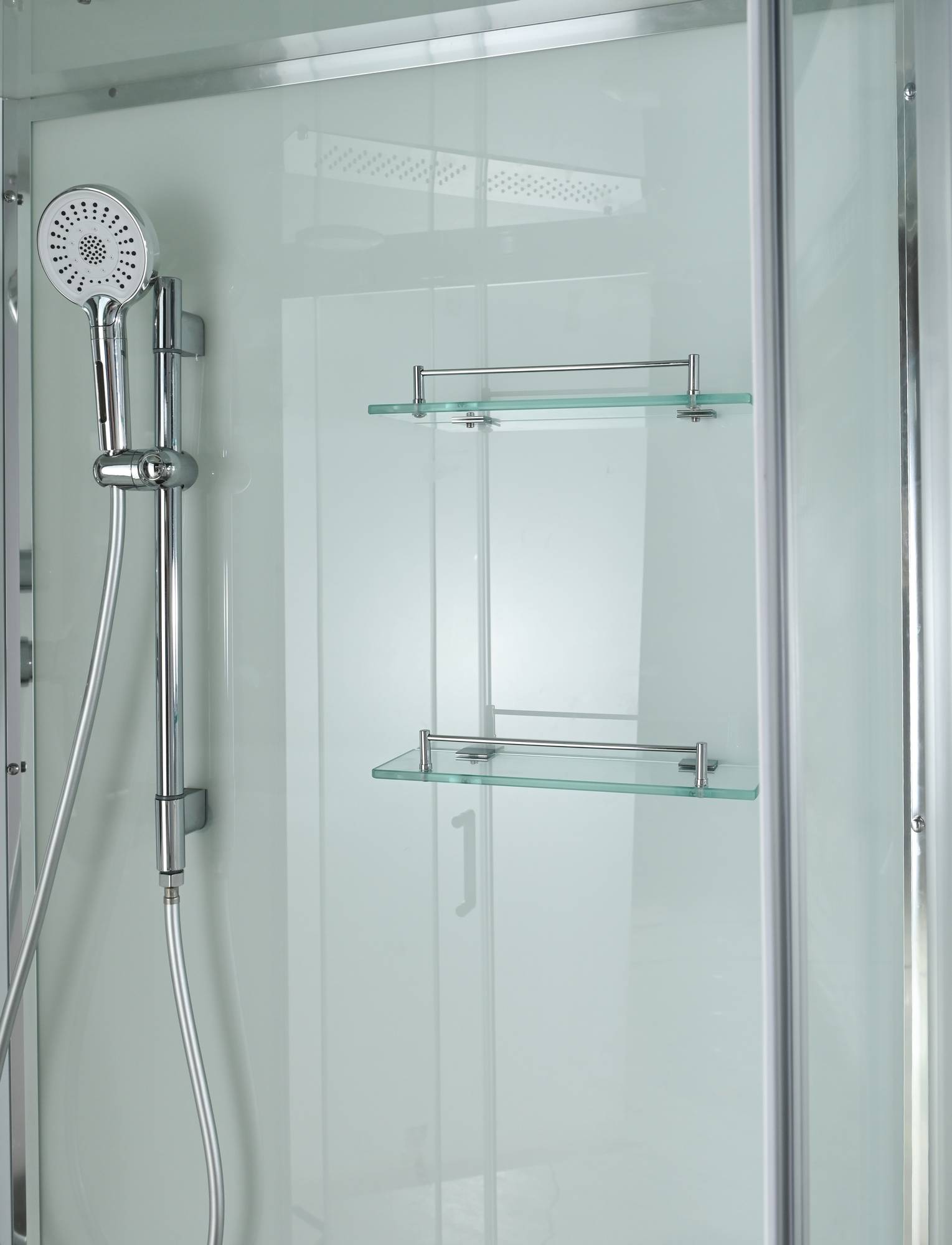 | Оснащение | душевая кабина / блютуз / led подсветка / радио / вытяжка / гидромассаж спины / полимерная вставка в поддон (имитация дерева) / сифон / переключатель режимов / полочки / резьбовой смеситель / тропический (верхний) душ / ручки дверей из нержавейки / арома-лейка с витамином C / душевая штанга |