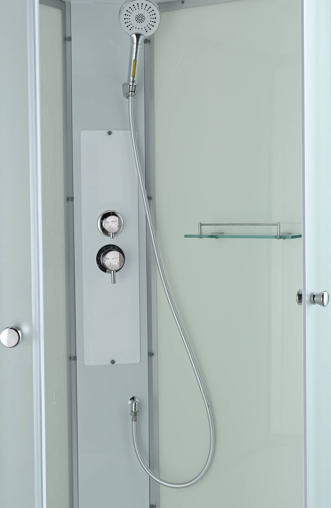 Комплект поставки: душевая кабина, сифон, переключатель режимов, полочки, резьбовой смеситель, арома-лейка с витамином
