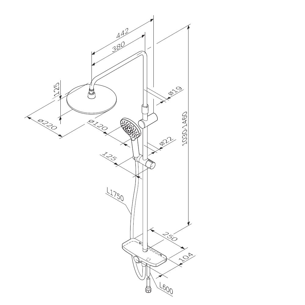 Премиальные размеры и продуманные детали: увеличенный диаметр душевых леек (верхний душ 220 мм и ручной душ 120 мм) позволит ощутить преимущества тропического душа тогда как увеличенная длина шланга 1750 мм обеспечит свободу движений во время принятия душа. Телескопическая поворотная штанга регулируется по высоте в диапазоне от 1030 до 1460 мм обеспечивая комфорт для людей любого роста а шаровой шарнир в держателе верхнего душа позволяет регулировать угол его наклона.