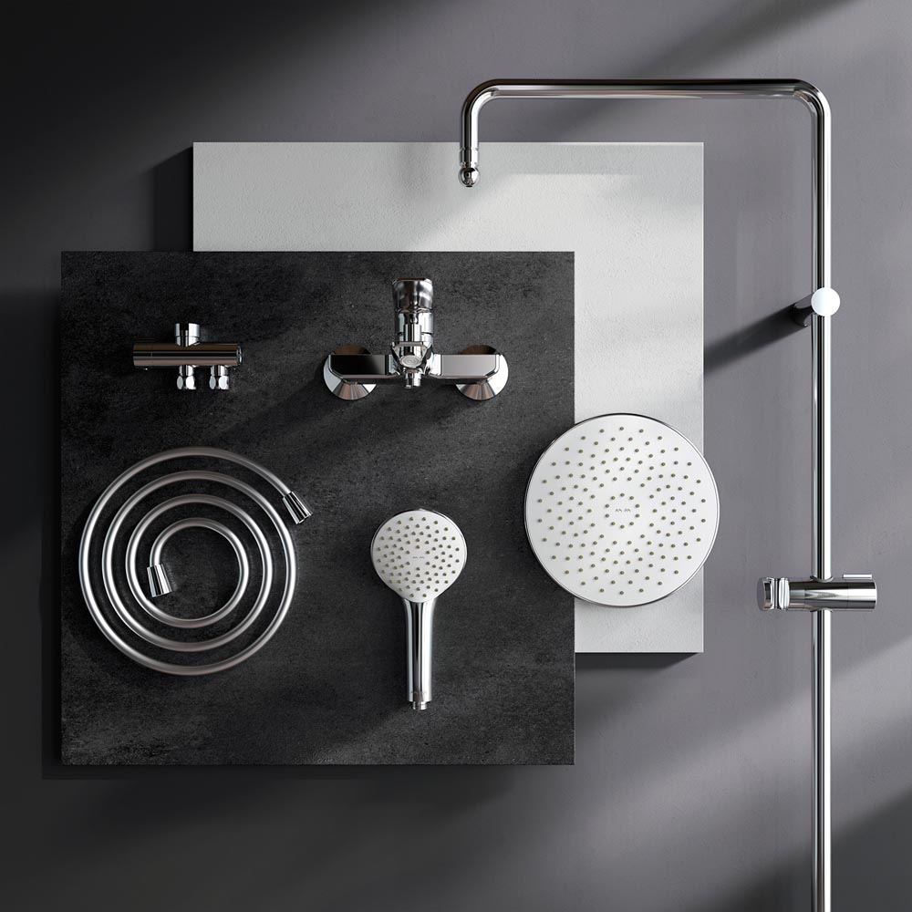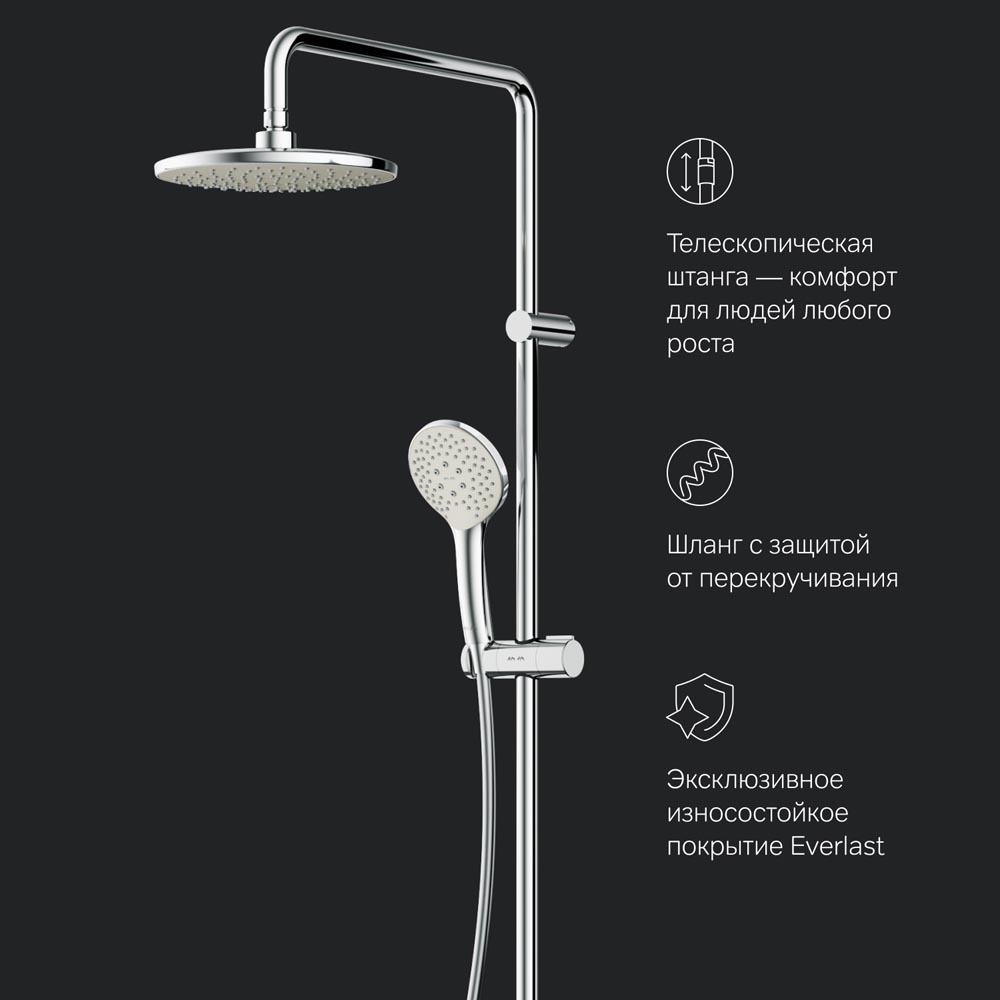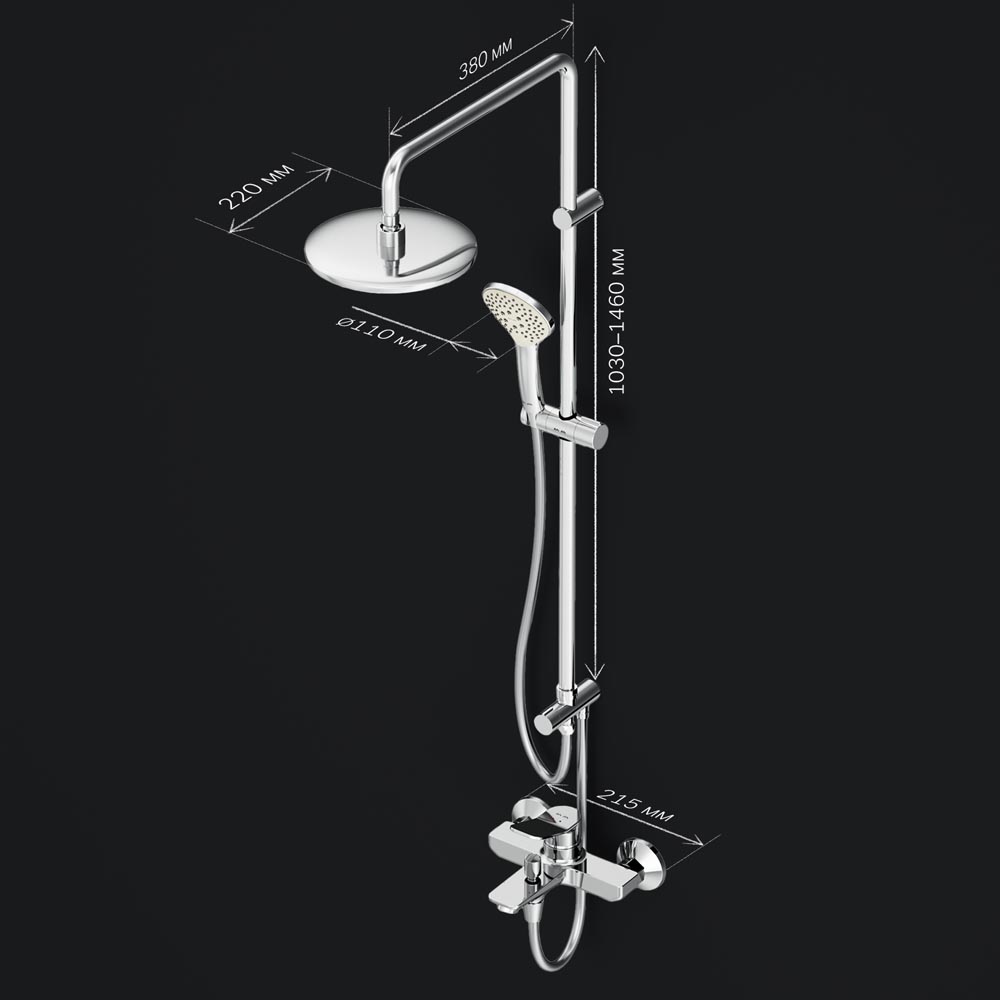 Продуманные детали душевой системы для удобства использования: штанга регулируется по высоте в диапазоне от 1 030 до 1 460 мм обеспечивая комфорт для людей любого роста шаровый шарнир в держателе верхнего душа позволяет регулировать угол его наклона душевой шланг 1750 мм верхний душ диаметром 220 мм ручной душ диаметром 110 мм.