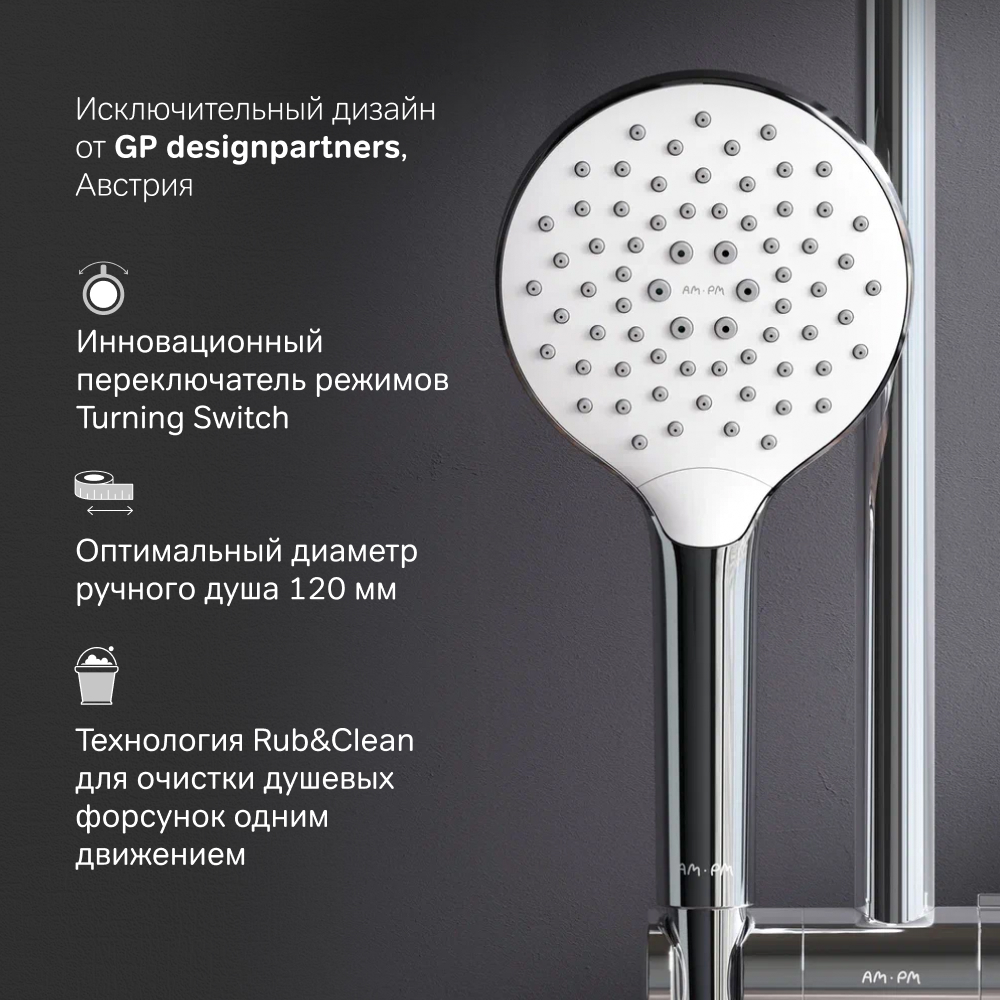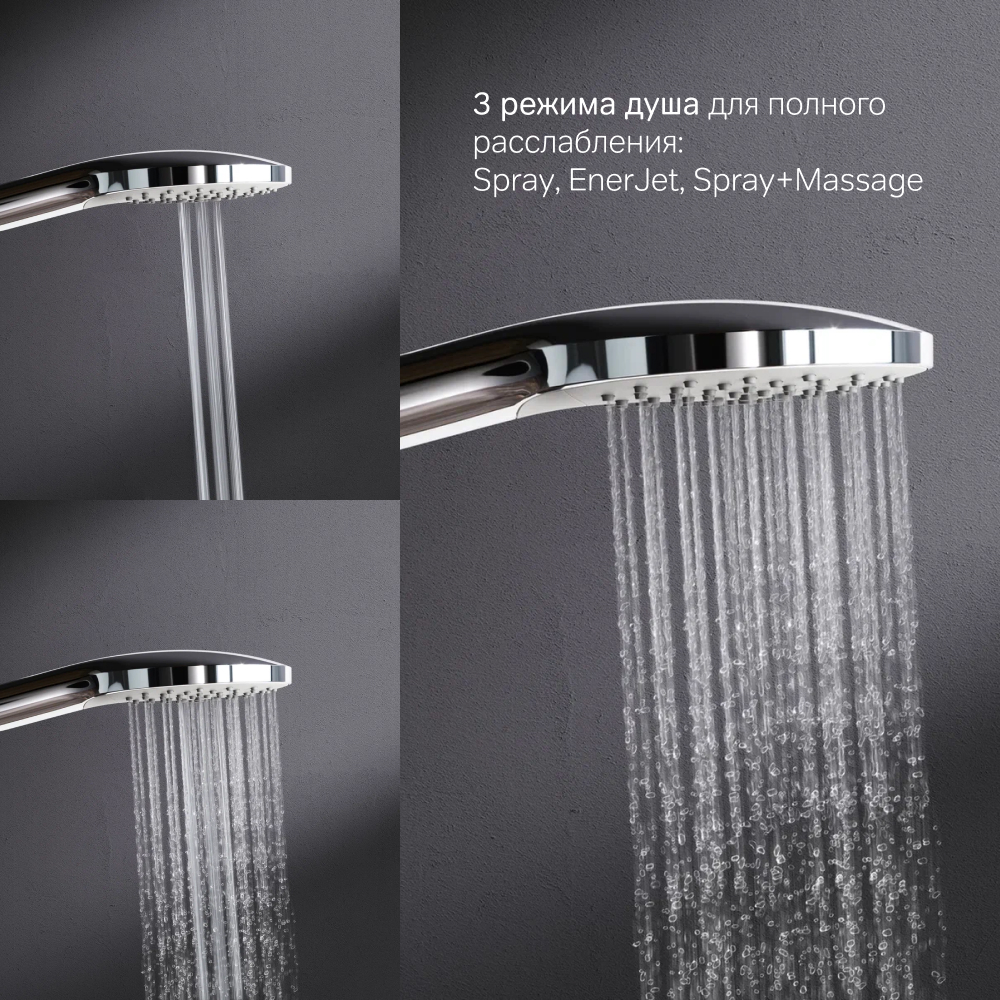 3 режима ручного душа: Spray EnerJet Spray + Massage с инновационным переключателем режимов Turning Switch функция Rub&Clean для легкой очистки душевых форсунок функция Аir In для повышения эффективности и экономии воды регулируемый держатель ручного душа шарнирное соединение защищает душевой шланг от перекручивания.