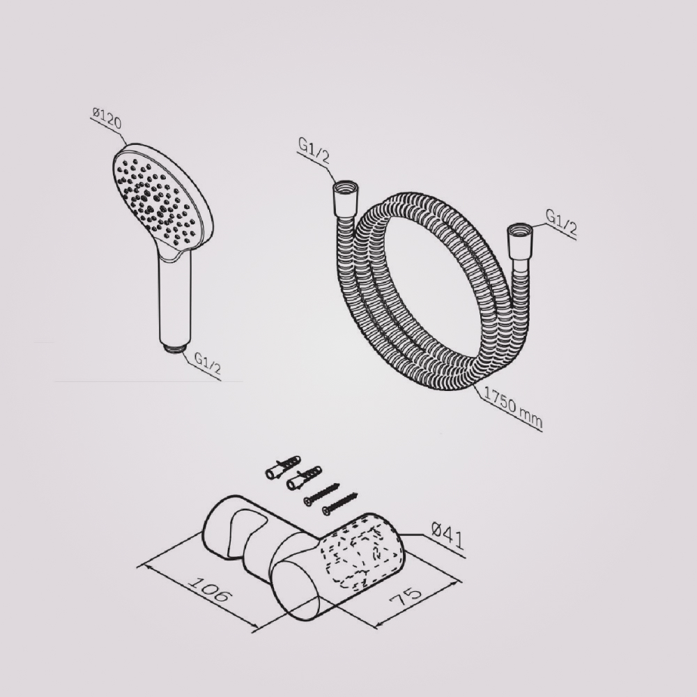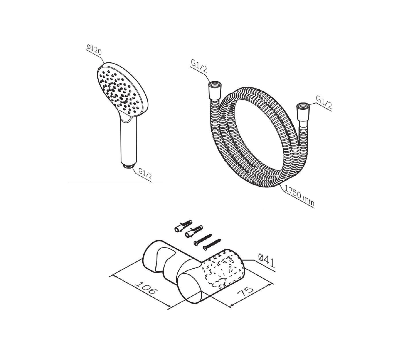Комплект поставки: держатель штанги, держатель душевой лейки, штанга, душевая лейка, душевой шланг.