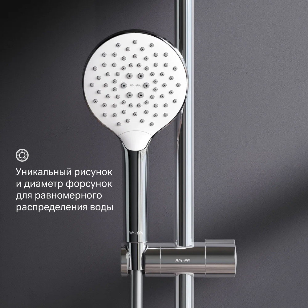 Уникальный рисунок и диаметр форсунок – дизайн равномерное распределение воды при любом напоре и обеспечивает максимум удовольствия от душа.