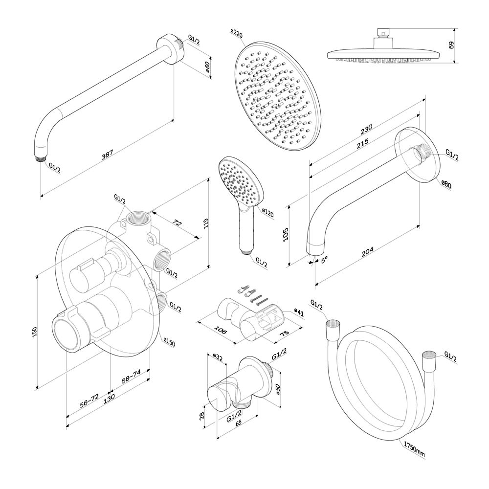 Комплект поставки: смеситель, верхний душ, излив для ванны, душевой гарнитур, аэратор, эксцентрики.