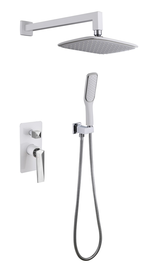 Комплект поставки: душевой шланг, душевая лейка, держатель для душа, переключатель потоков, смеситель, верхний душ.