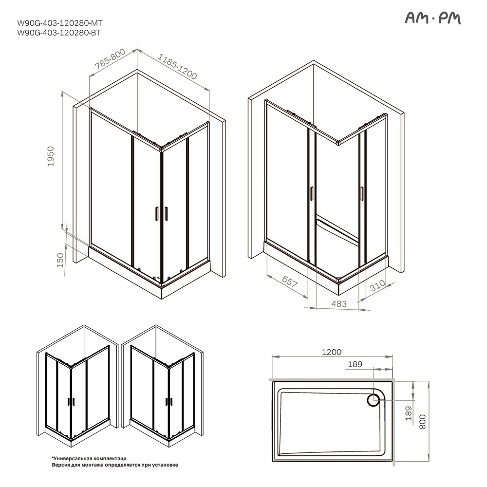 Душевой уголок AM.PM Gem 120x195x80 W90G-403-120280-BT профиль черный