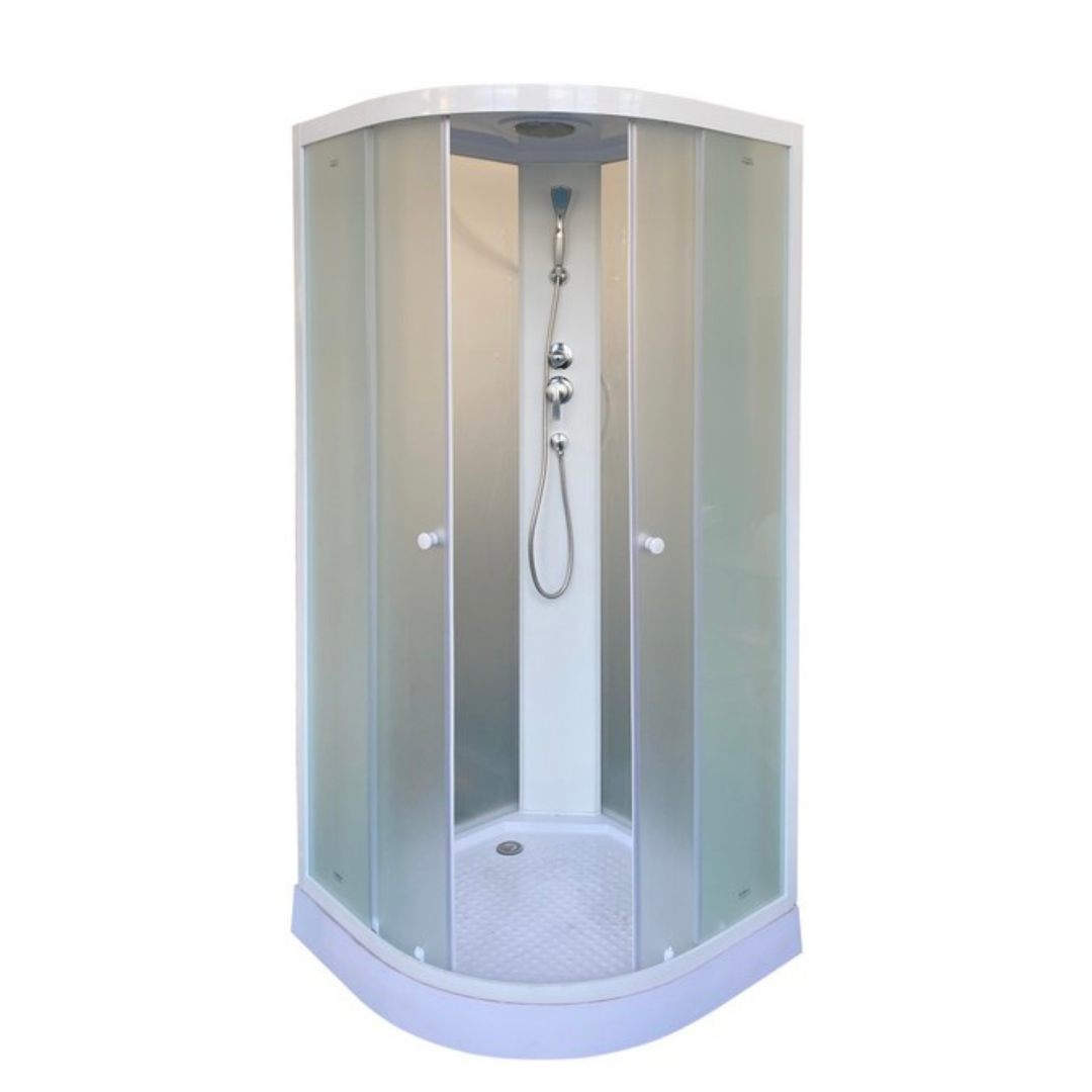 Бюджетная компактная кабина – отличный выбор для маленькой ванной комнаты и дачи. Светлая кабина визуально расширяет пространство, а полукругла форма экономит полезную площадь в санузле.