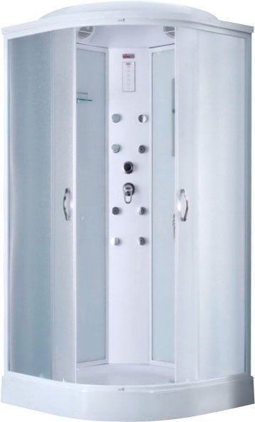 Поддон: акрил армирован стекловолокном, на усиленном каркасе с сифоном (диаметр 50мм).Высота 15см. Задние стенки: закаленное стекло, светлого оттенка.Передние стенки: стекло структурное матовое, закаленное. Конструкция дверей: раздвижная.Центральный столб : матовый,белый, сантехнический ABS-пластик.Профиль: алюминиевый, белый, матовый.Комплектация: сенсорный пульт управления; FM-радио; эл. вентиляция; подсветка верхняя; смеситель однорычажный трехрежимный; зеркаловерхний душ; ручная лейка на регулируемой по высоте штанге;гидромассаж спины (8 джет); стеклянная полочка; саморугулирующиеся двойные ролликиОСОБЕННОСТИ! Импортозамещение. Безсиликоновая технология сборки. Предлаем Вам купить в САНКОРС по лучшей цене!