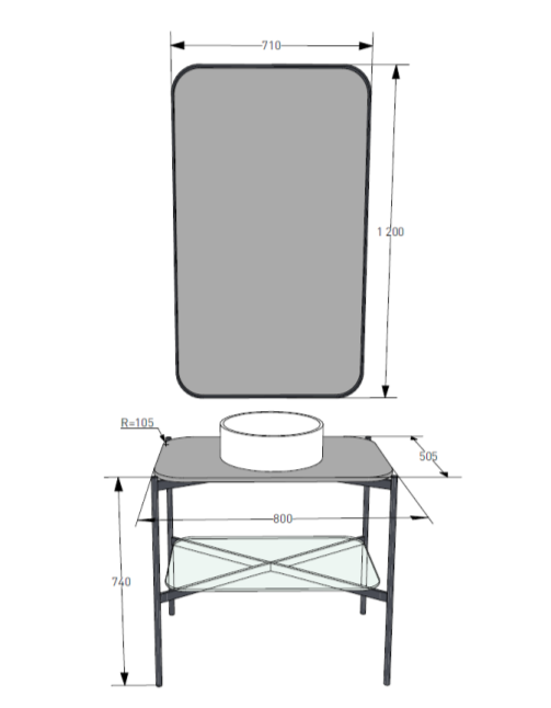 Комплект поставки: консоль со столешницей, полка, металлический сифон, крепления, зеркало.