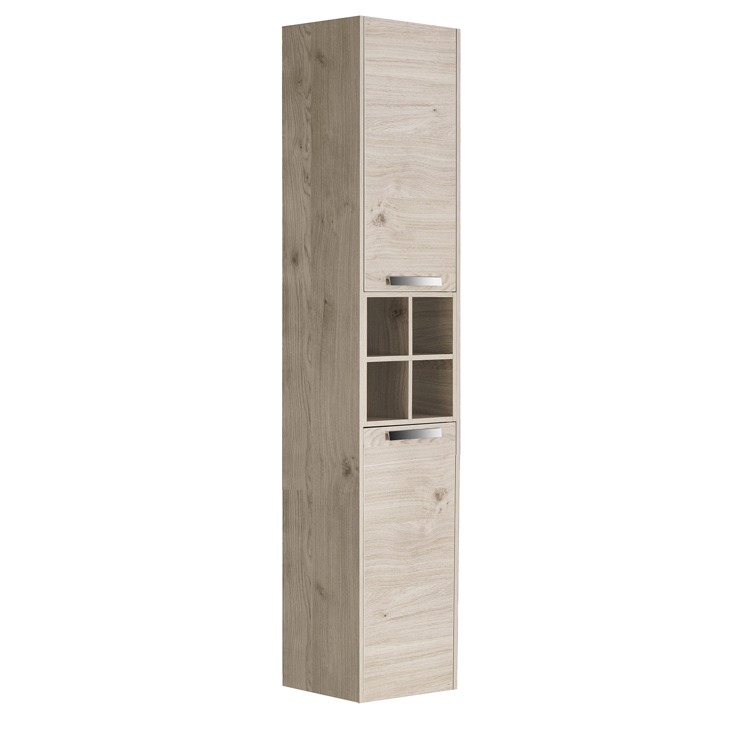 Шкаф-колонна Lago в современном стиле от испанского бренда Roca, выполненная из высококачественной влагостойкой ЛДСП в цвете светлый дуб, с бельевой корзиной.
