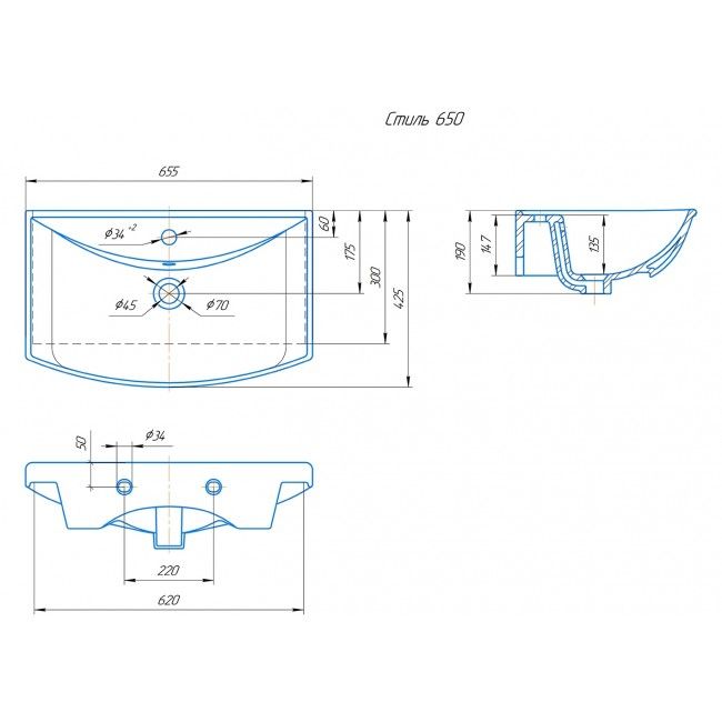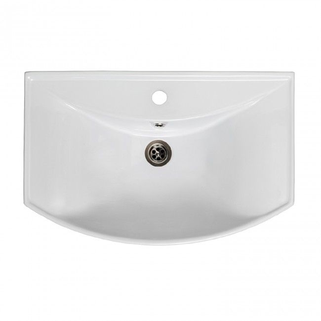 Умывальник Стиль 65 - полувстраиваемый, монтируется непосредственно на тумбу, с возможностью крепления к стене. Полукруглая форма раковины Стиль оптимальных размеров: шириной 65 см, глубиной 40 см, высотой 19 см, способствует комфорту использования и монтажа. Материал раковины - фарфор, который отличается максимально гладкой поверхностью и абсолютной гигиеничностью. Совместима с тумбами под раковину RUNO - Стиль 65, Толедо 65.