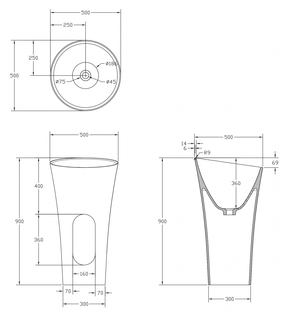 Форма: круглаяМатериал: искусственный каменьЦвет: белый матовыйГабариты: 50 x 90 x 50
