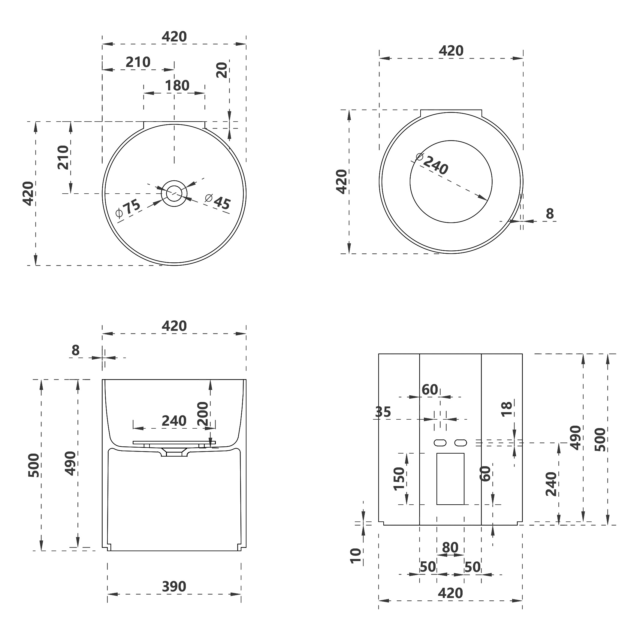 Форма: круглаяМатериал: искусственный каменьЦвет: белый матовыйГабариты: 42 x 50 x 42
