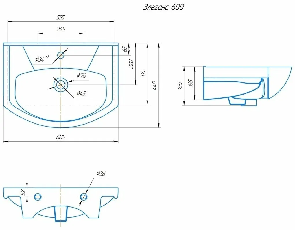 Умывальник Элеганс 60 - полувстраиваемый, монтируется на тумбу, с возможностью крепления к стене. Полукруглая форма раковины оптимальных размеров: шириной 60,5 см, глубиной 44 см, высотой 19 см. Материал раковины - фаянс с максимально гладкой поверхностью.