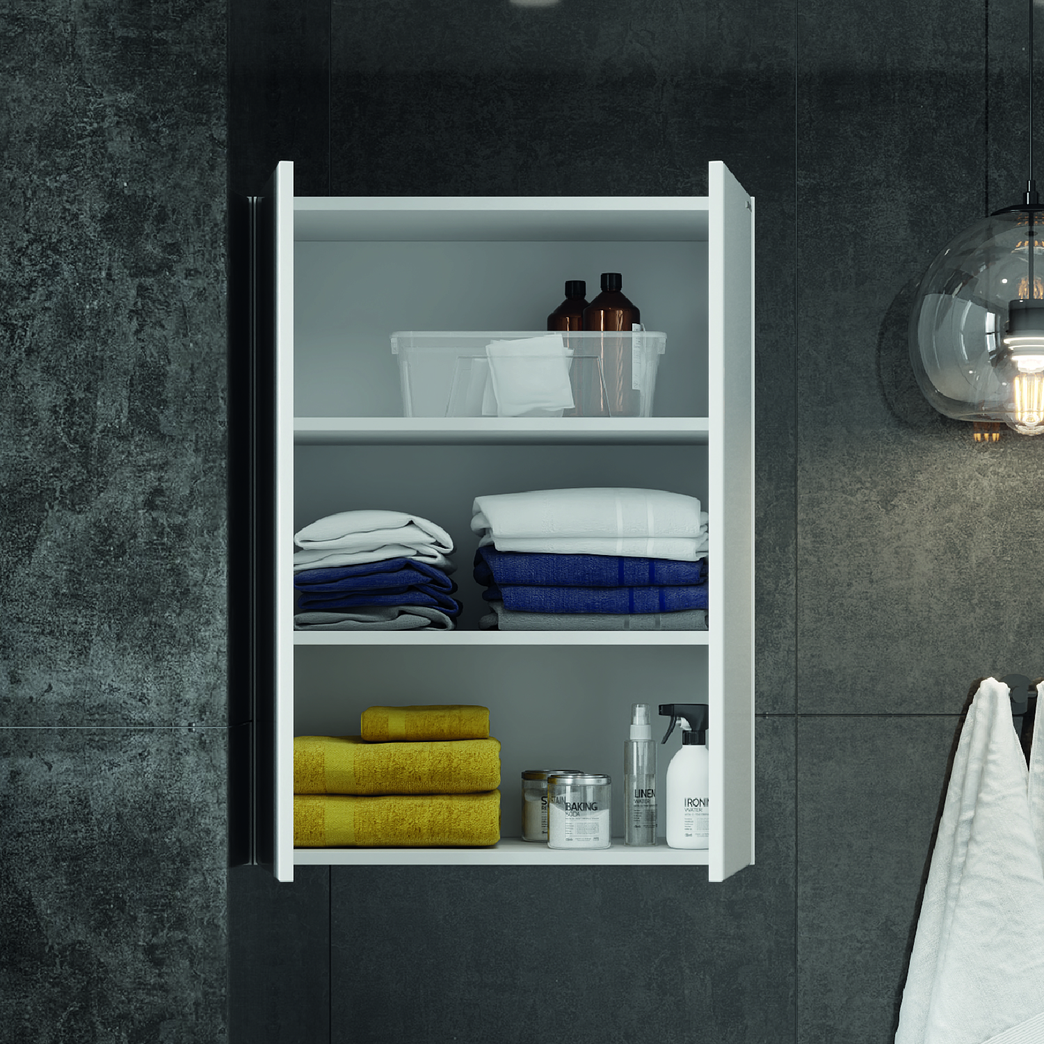 Компактные габариты позволяют грамотно организовать небольшой санузел (подвесной шкаф можно разместить над стиральной машиной), а пространство за распашными дверцами с доводчиками поможет разместить все необходимые вещи.