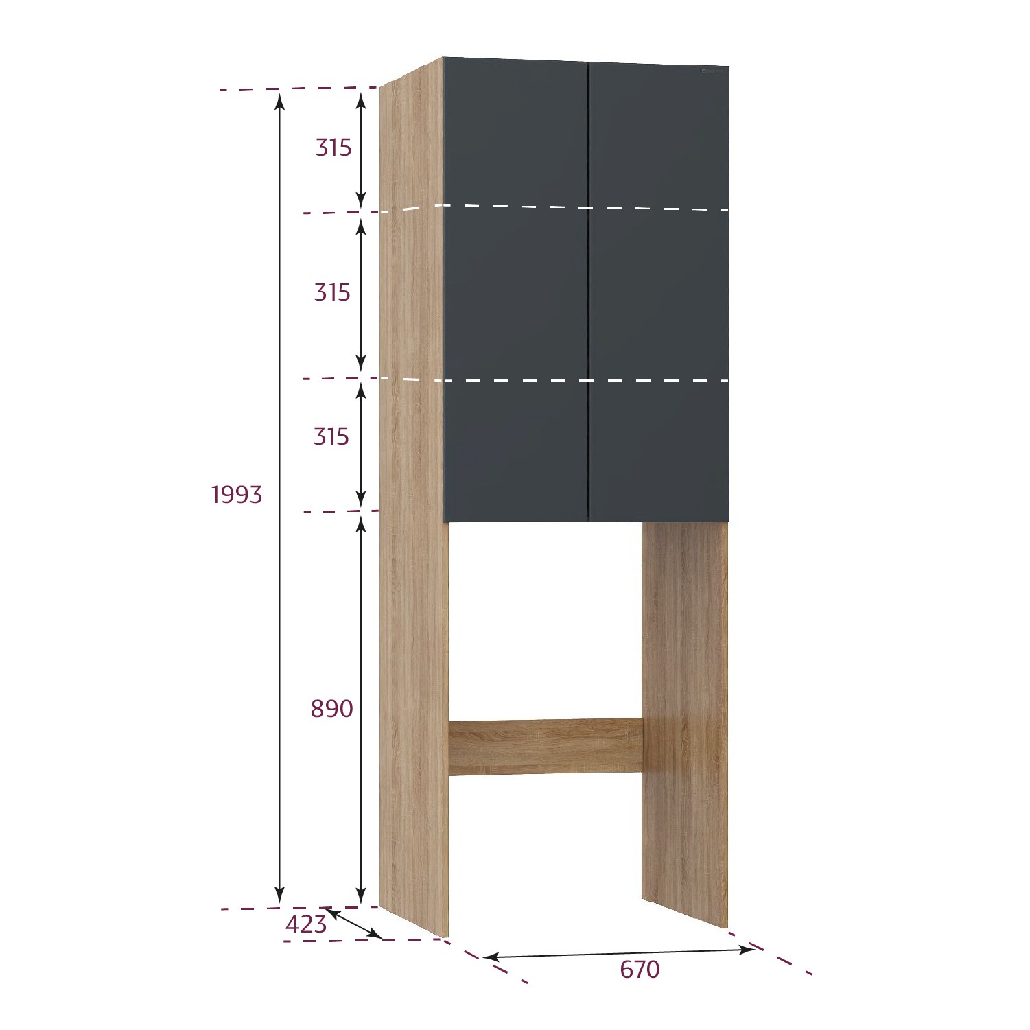Шкаф Onika Милтон 67 напольный, серый/дуб сонома, для стиральной машины, разборный / 67х42х200см