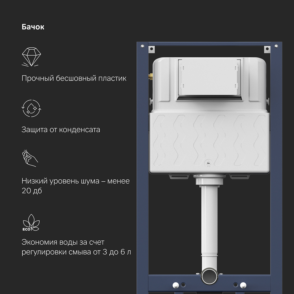 Благодаря цельному стальному профилю 40*40 мм толщиной 2 мм инсталляция выдерживает нагрузку до 400 кг. Цельный бесшовный бачок из полиэтилена с защитой от конденсации. Комфортное использование благодаря заливному клапану с низким уровнем шума - менее 20 Дб.