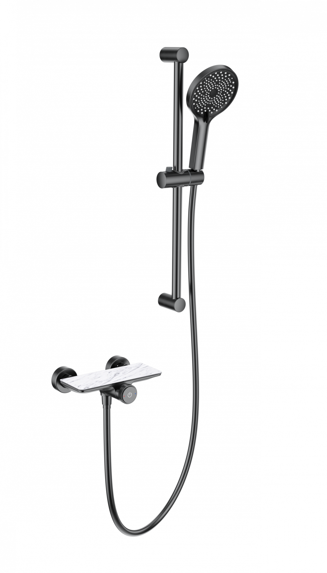 Комплект поставки: смеситель, душевой шланг, держатель для душа, полка, душевая штанга, душевая лейка, эксцентрики, монтажный комплект.