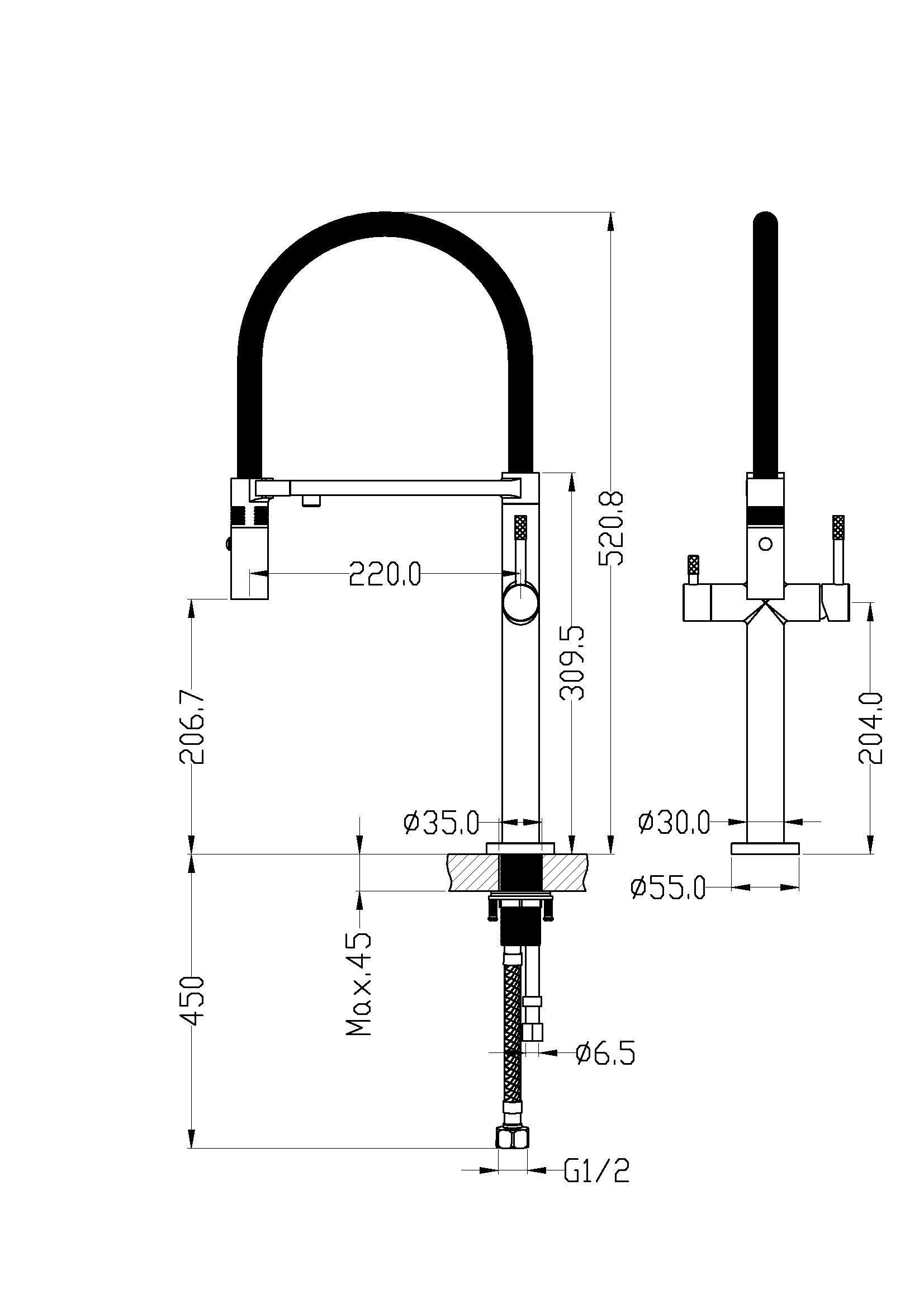 Комплект поставки: смеситель, гибкая подводка, крепления.