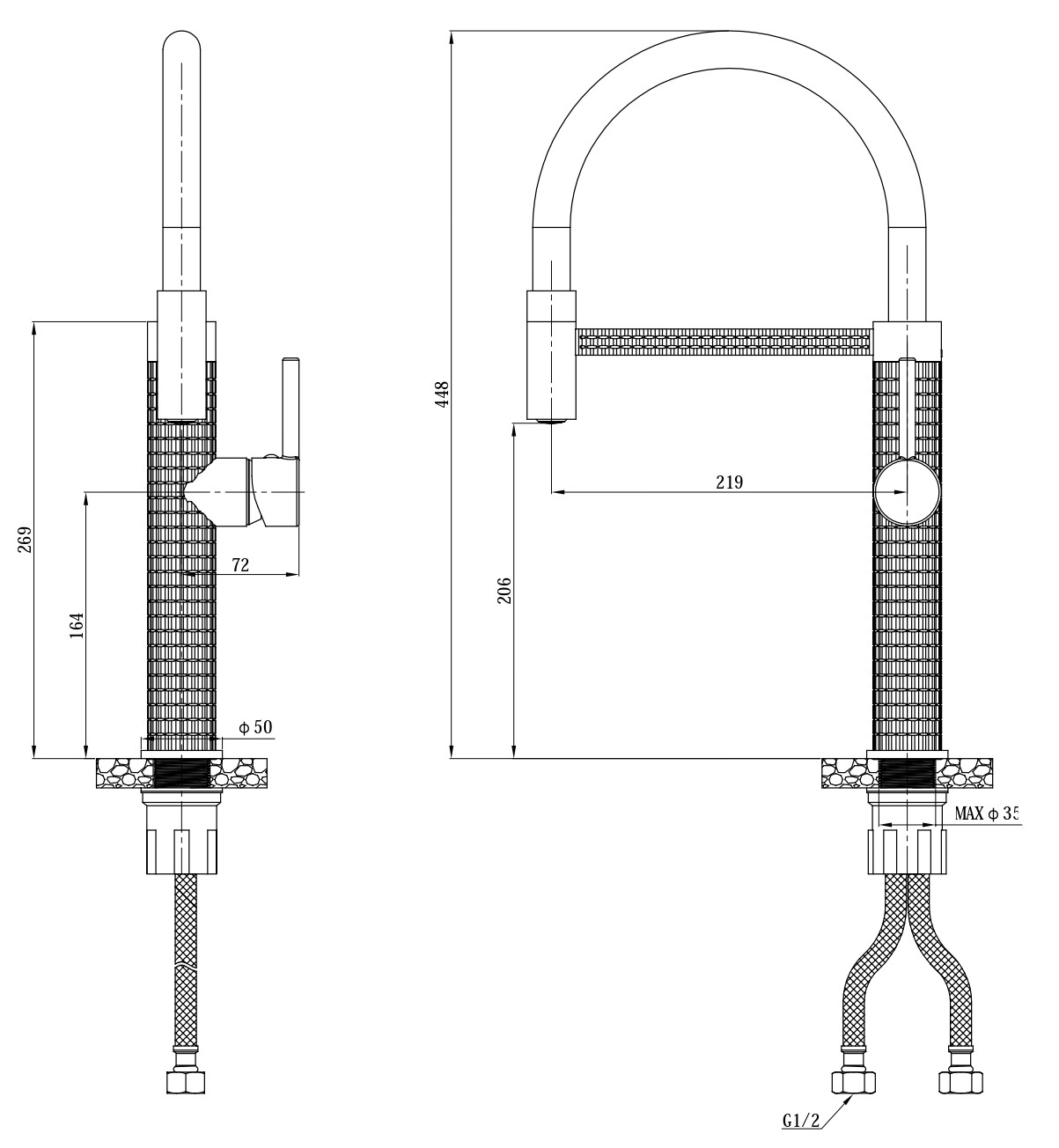 Комплект поставки: смеситель, гибкая подводка, крпеления.