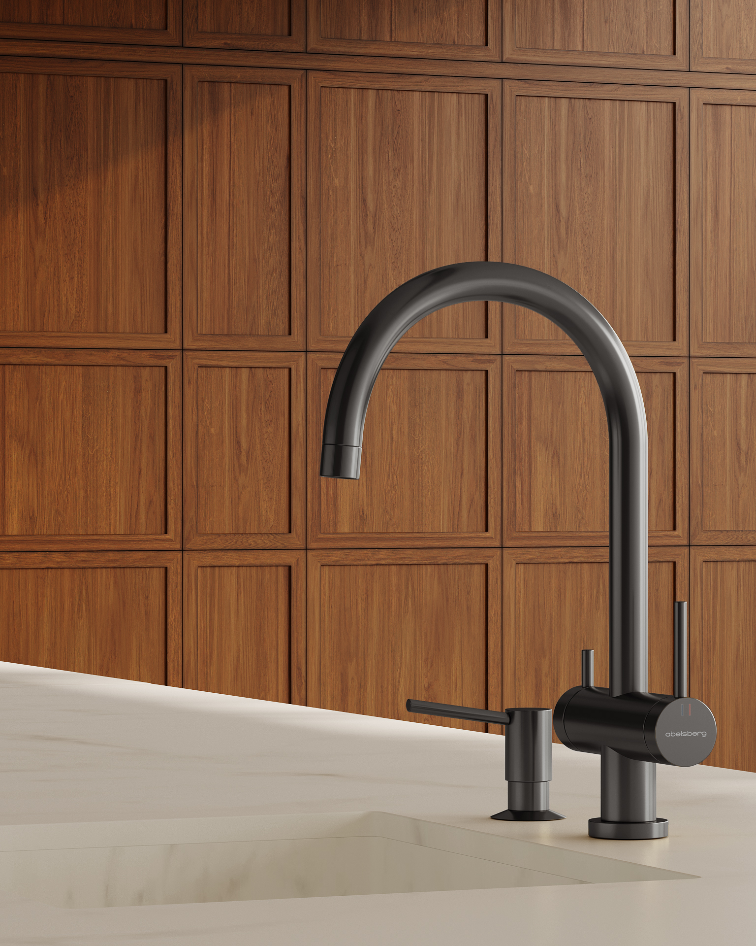 Коллекция Abelsberg Aera создаёт ощущение легкости и комфорта_x000b_на кухне. Отдельный канал для питьевой воды обеспечивает высокую гигиену, а мягкие линии и сбалансированная эргономика смесителя делают ежедневное использование приятным.