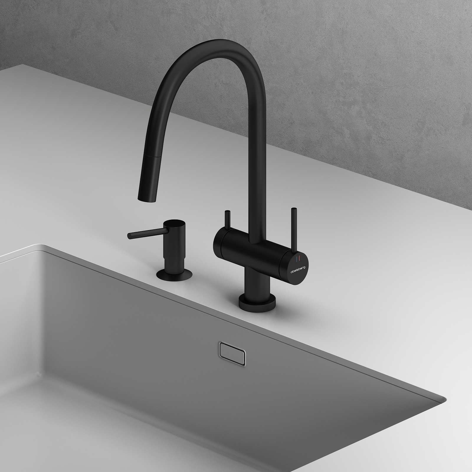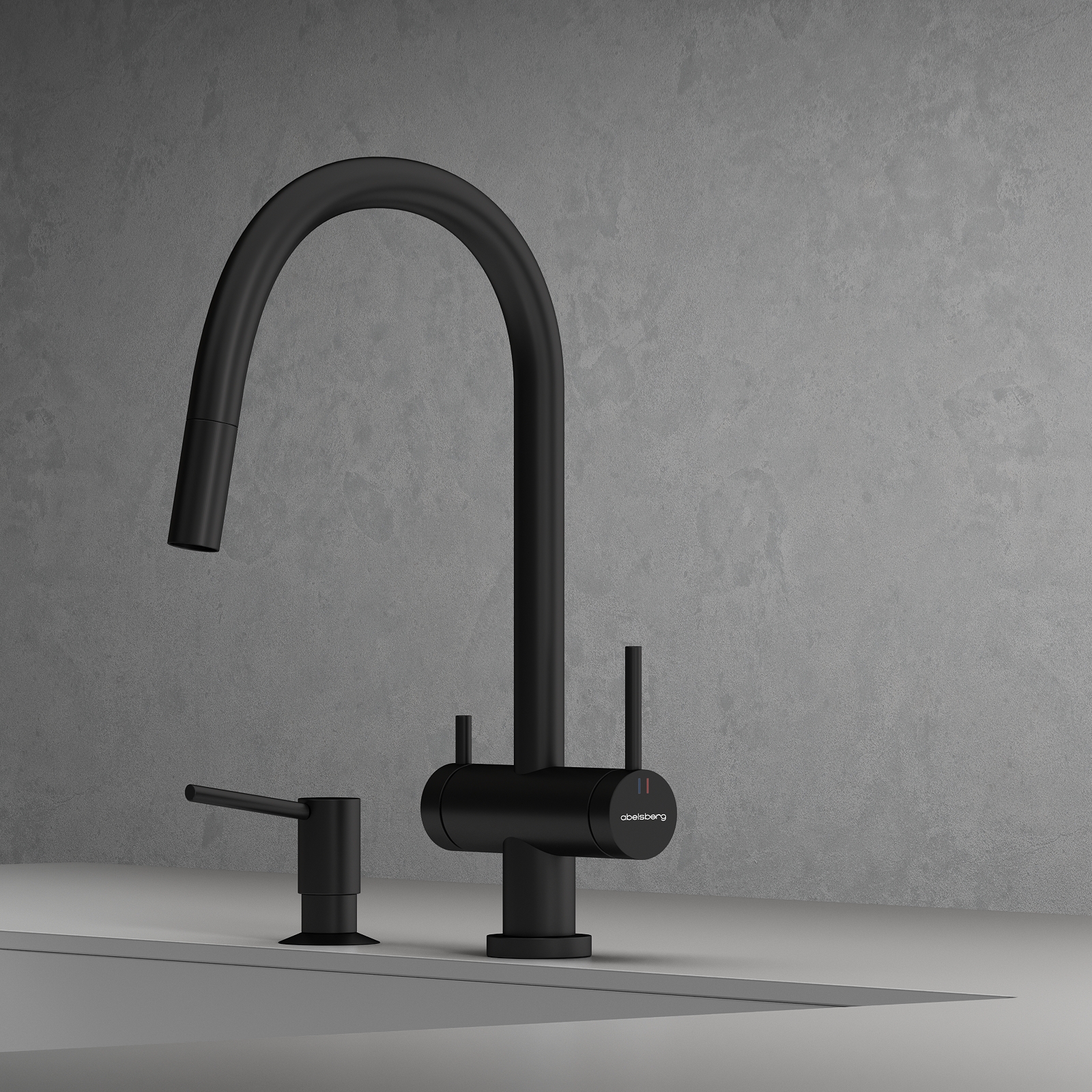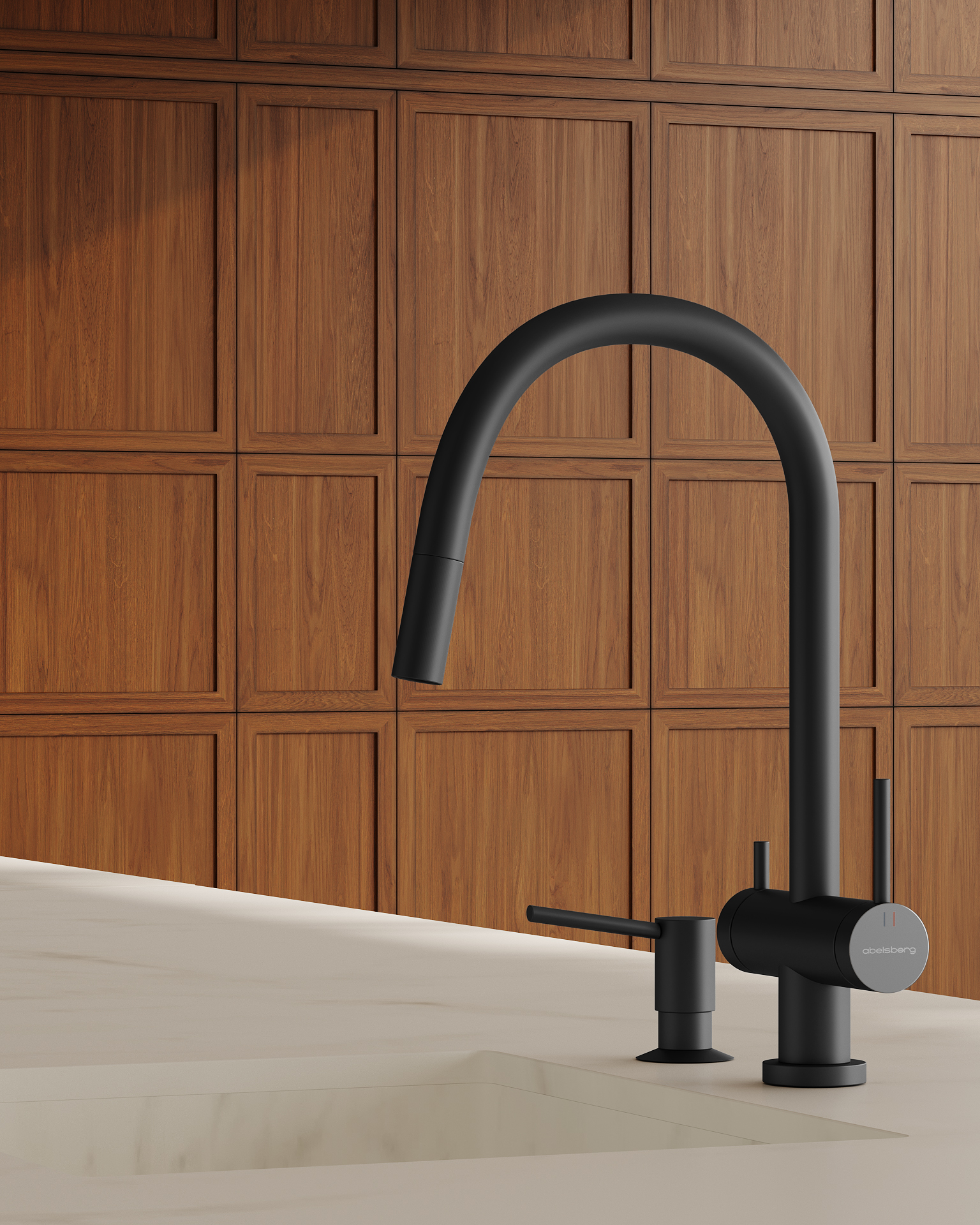 В коллекции Abelsberg Aera также представлена модель с вытяжным душем. Благодаря удлиняющемуся изливу, смеситель легко адаптируется под любые кухонные задачи — от мытья посуды до наполнения крупных ёмкостей.