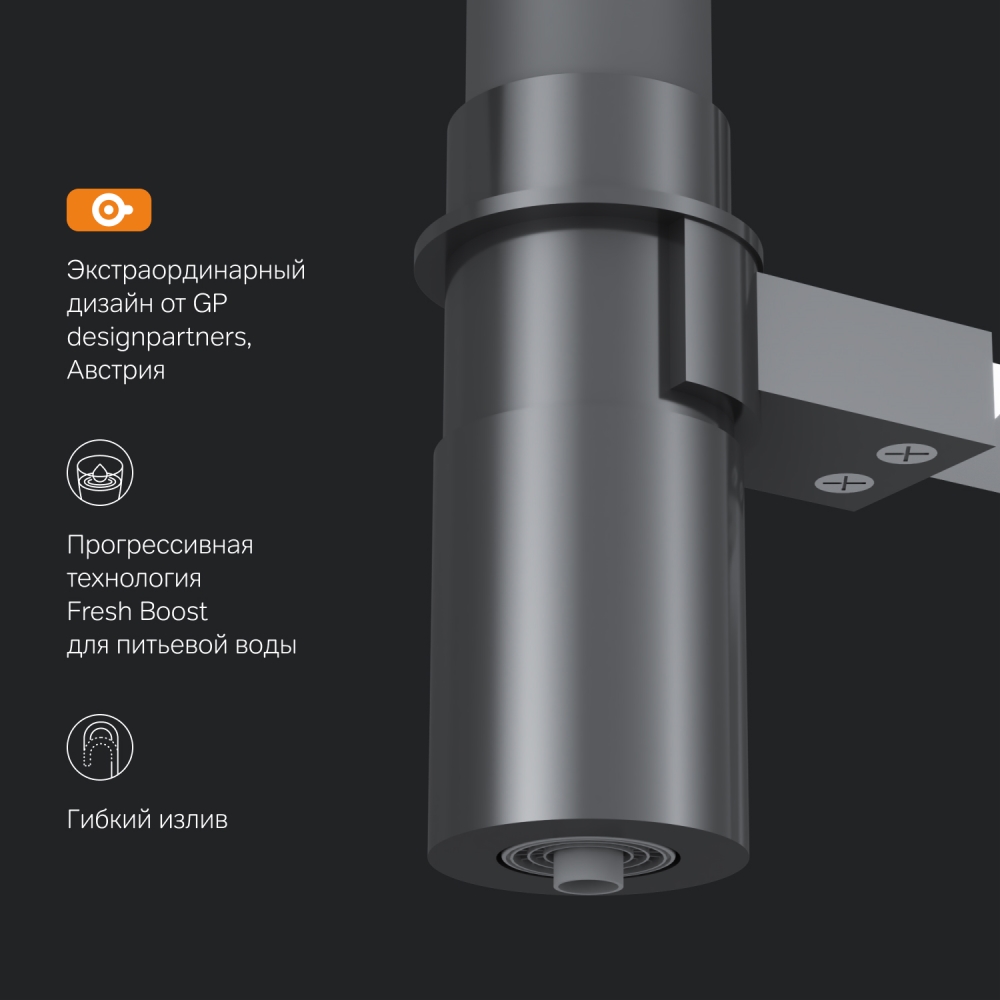 Смеситель оснащен встроенным каналом для питьевой воды. Благодаря прогрессивной технологии Fresh Boost при вращении ручки на 90 градусов вы можете наслаждаться чистой питьевой водой. Для получения обычной воды просто управляйте смесителем привычным способом.