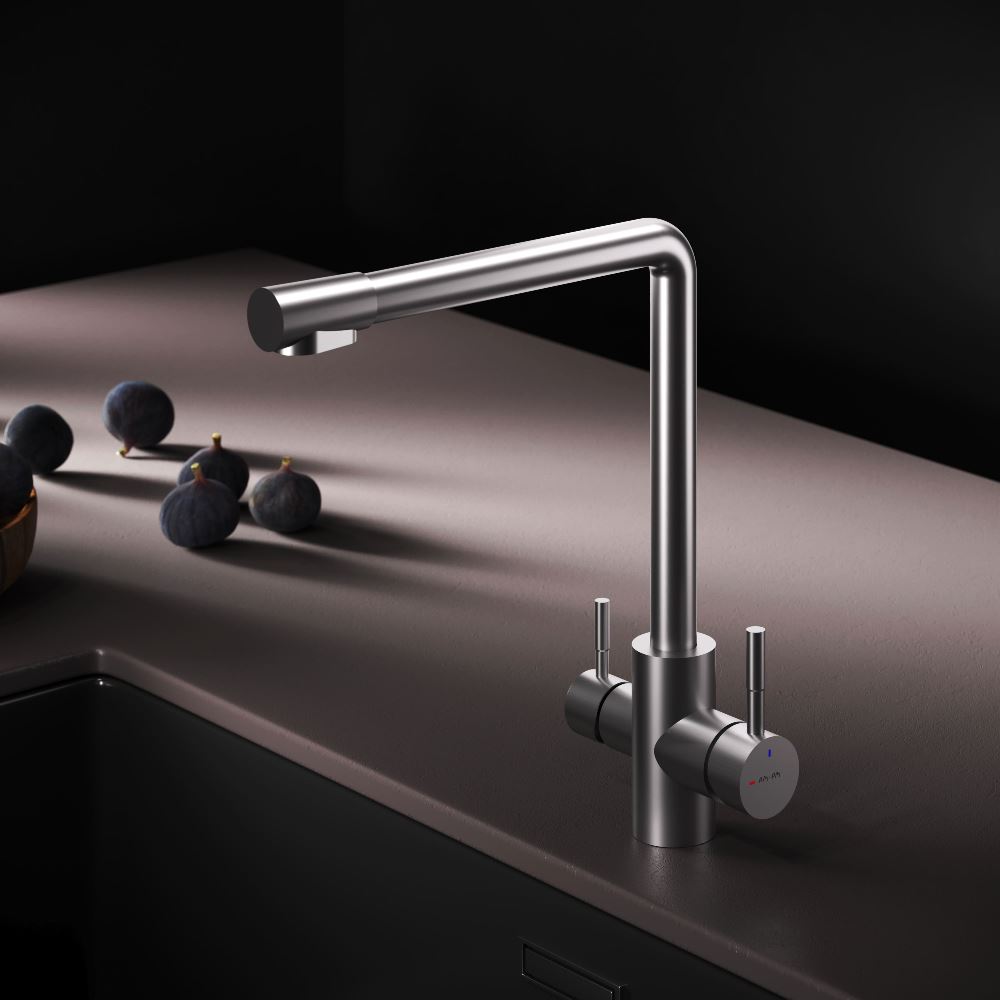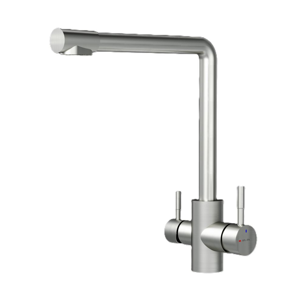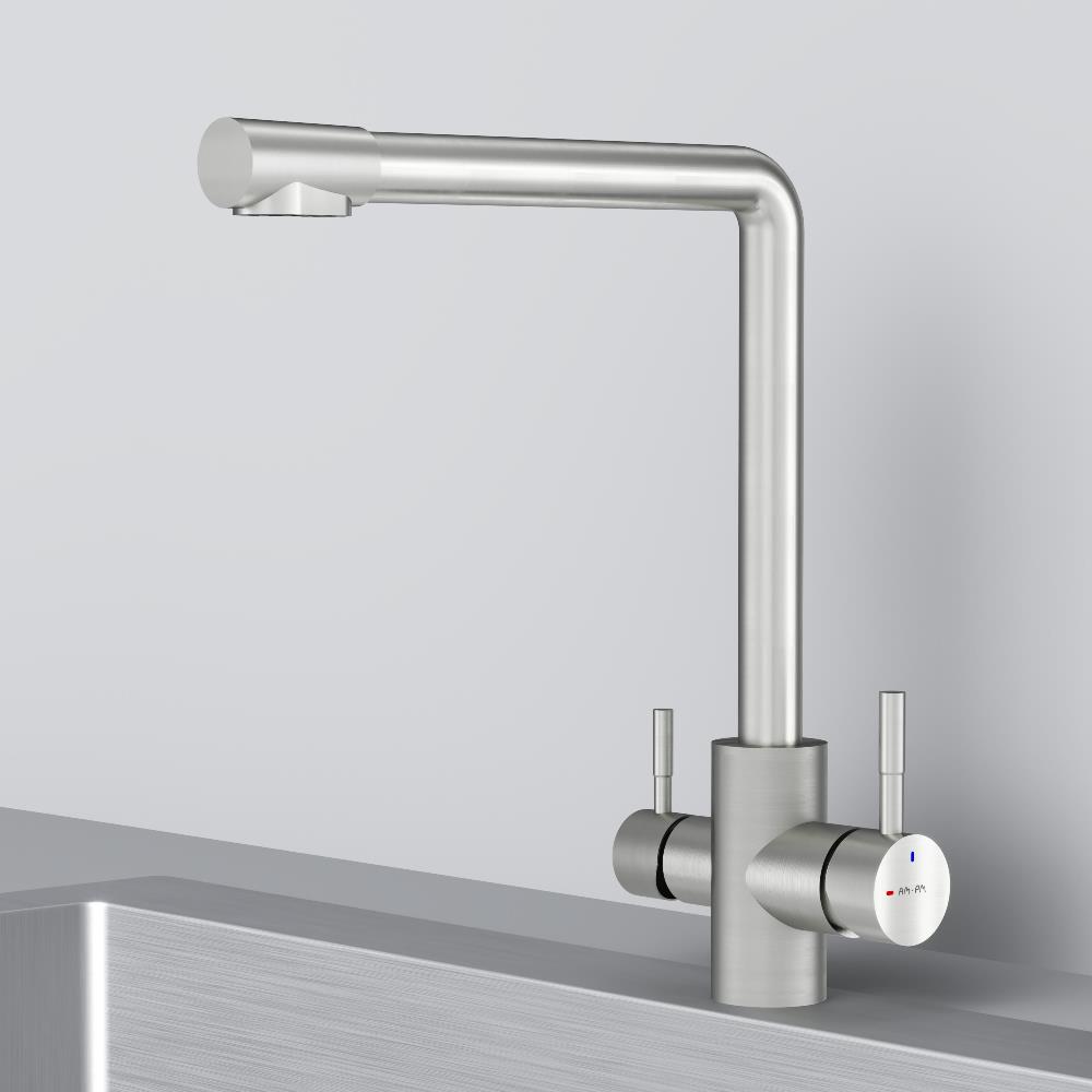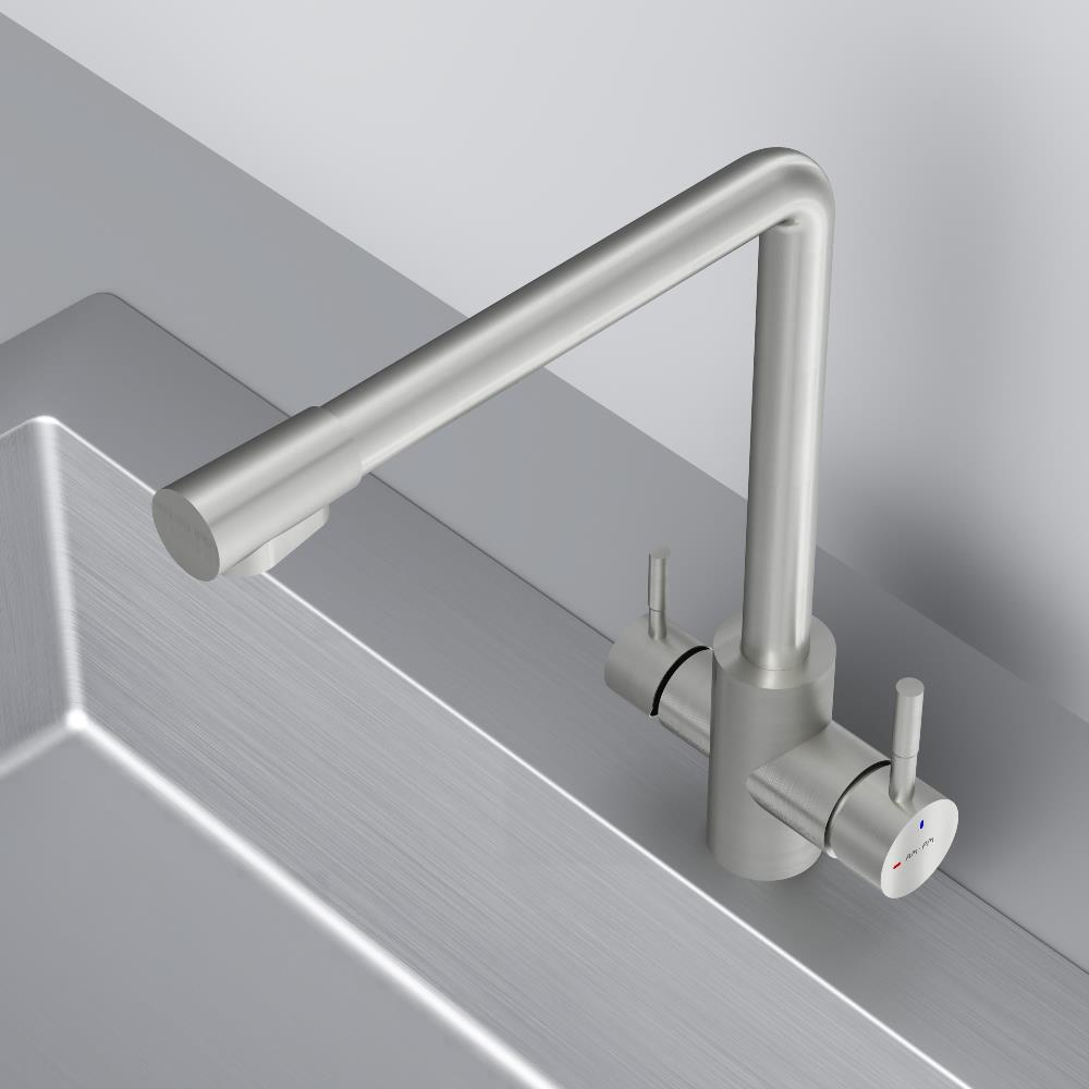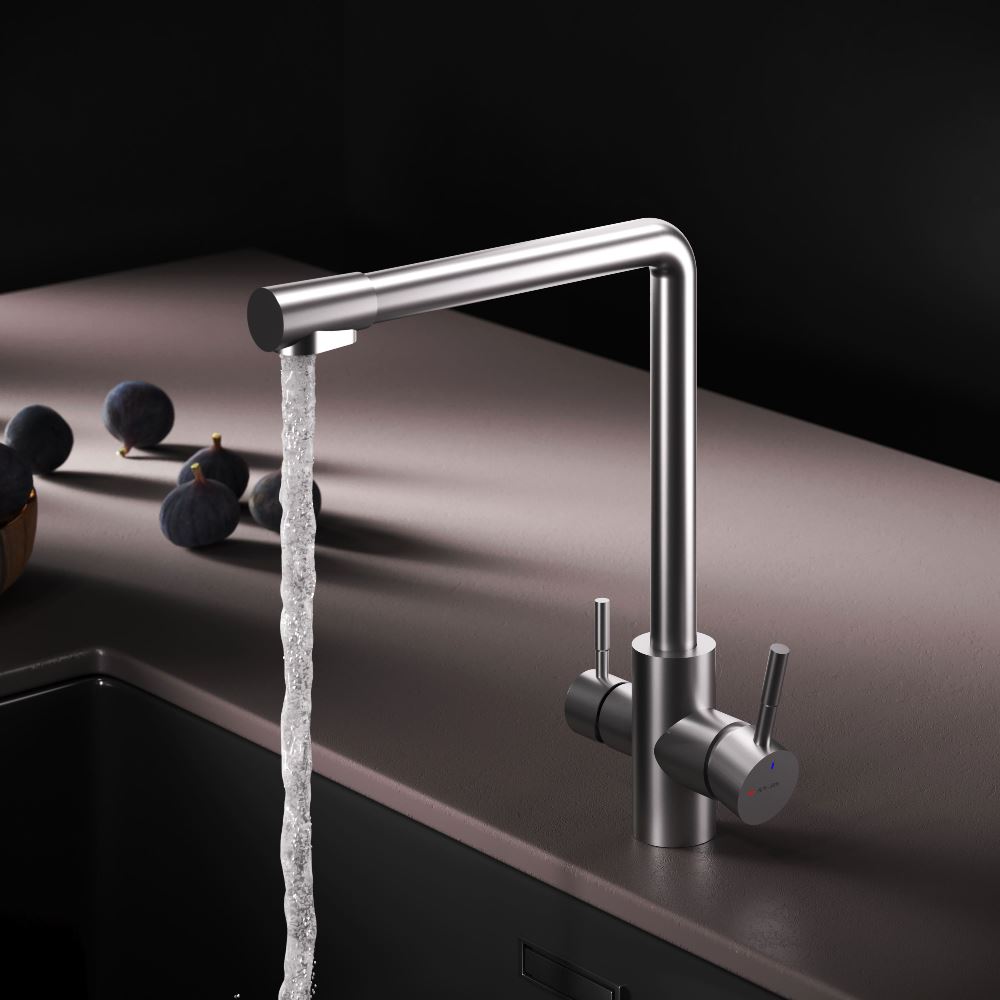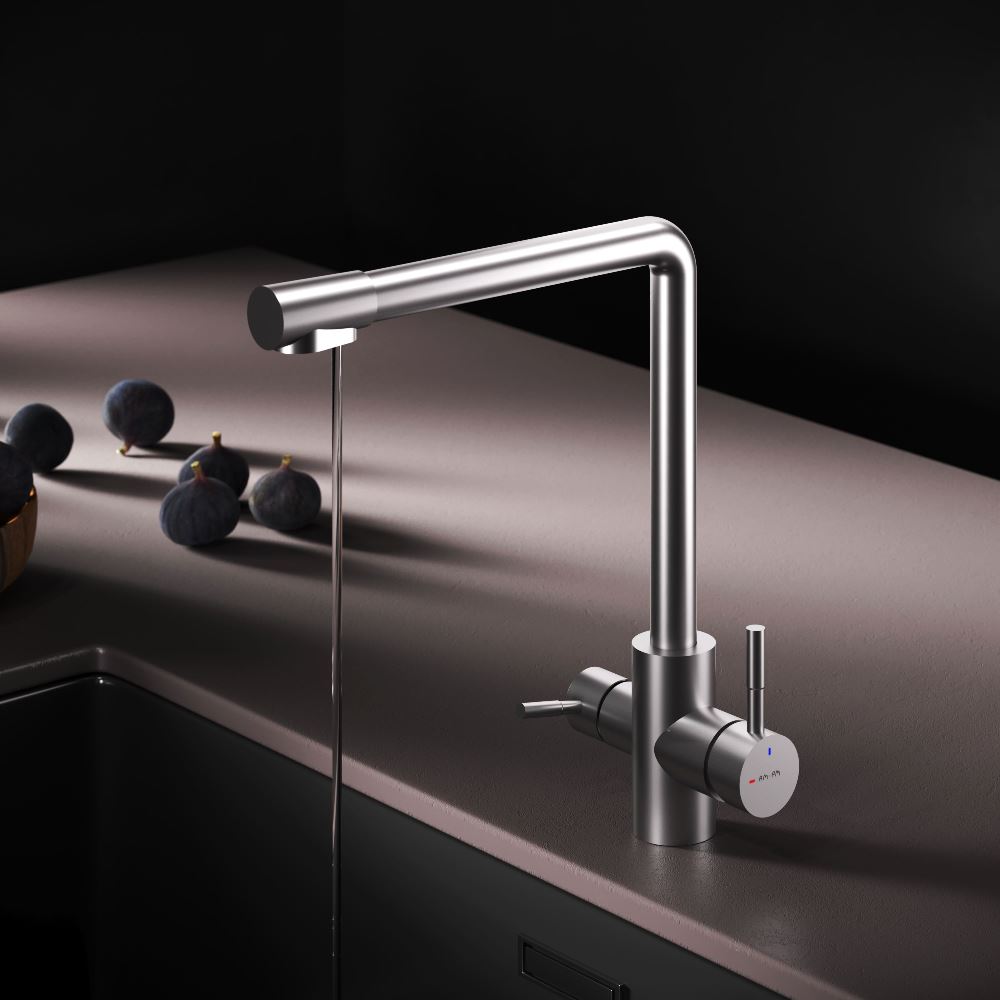 Смеситель оснащен встроенным каналом для питьевой воды. Для получения питьевой воды воспользуйтесь ручкой расположенной с левой стороны корпуса для получения обычной воды просто управляйте смесителем привычным способом.