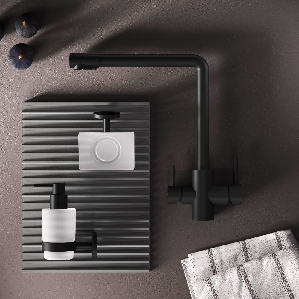 Эксклюзивное покрытие Everlast – вдвое превышает отраслевые стандарты по прочности и износостойкости. Черный матовый цвет сделает этот смеситель главным акцентом в любом интерьере. L-образная архитектура смесителя идеально подойдет для использования с мойкой любого размера и значительно упростит такие задачи как наполнение больших емкостей. Черный матовый цвет сделает этот смеситель главным акцентом в любом интерьере.