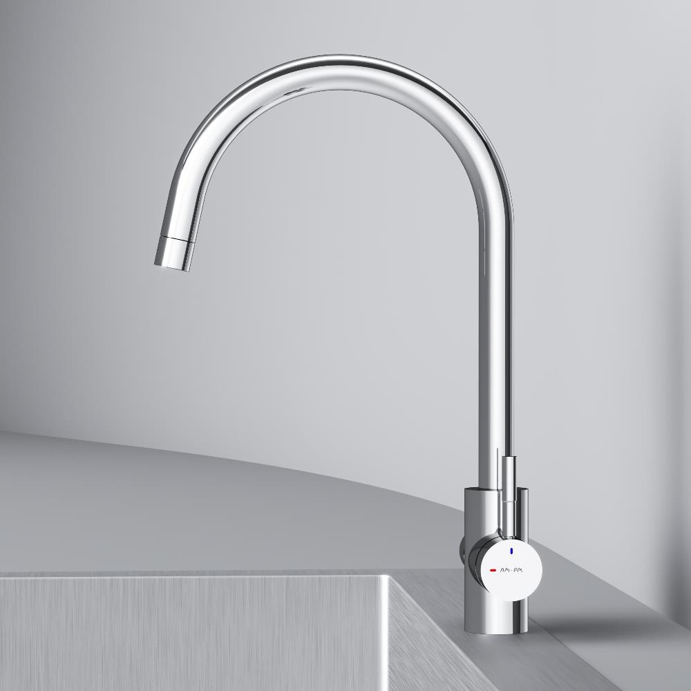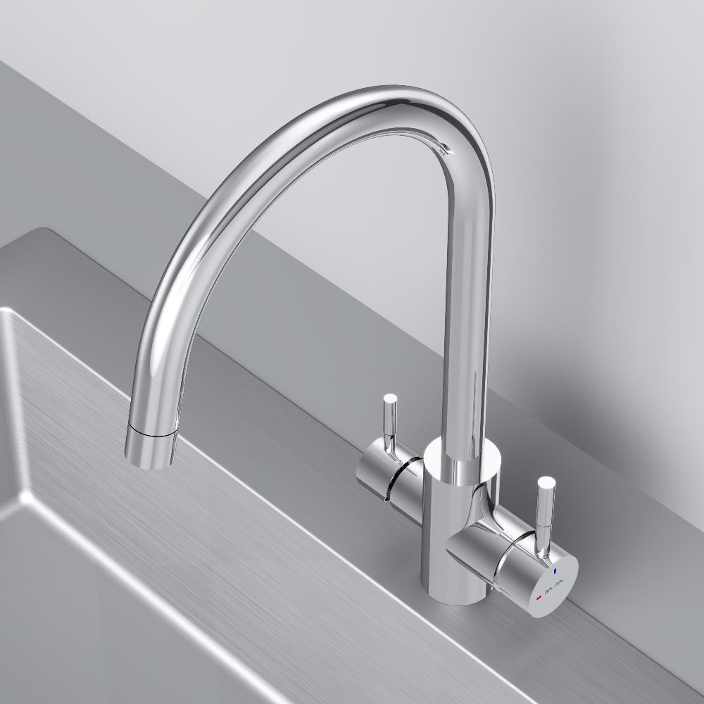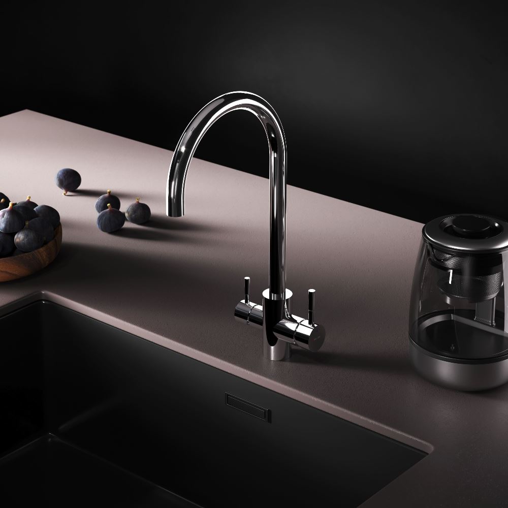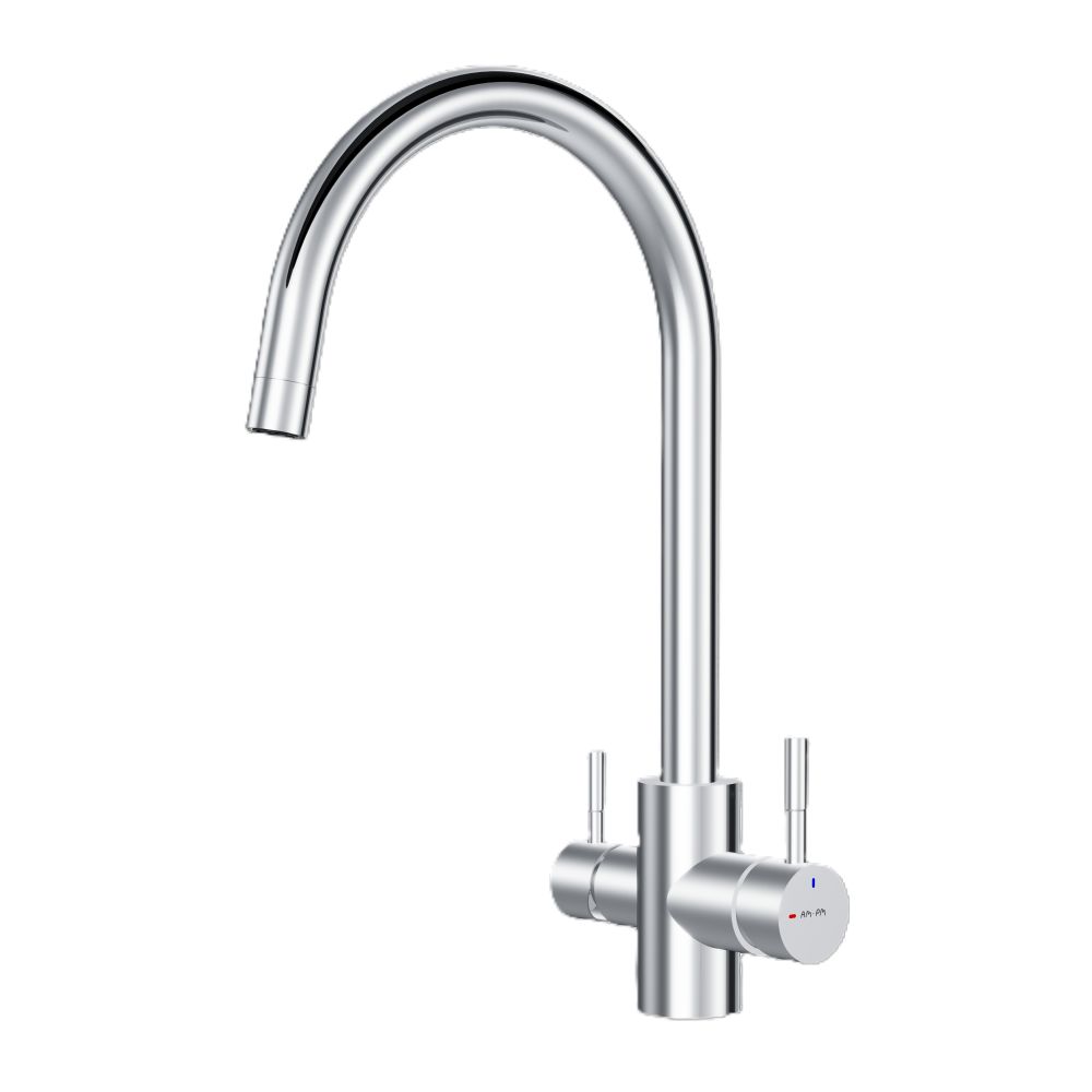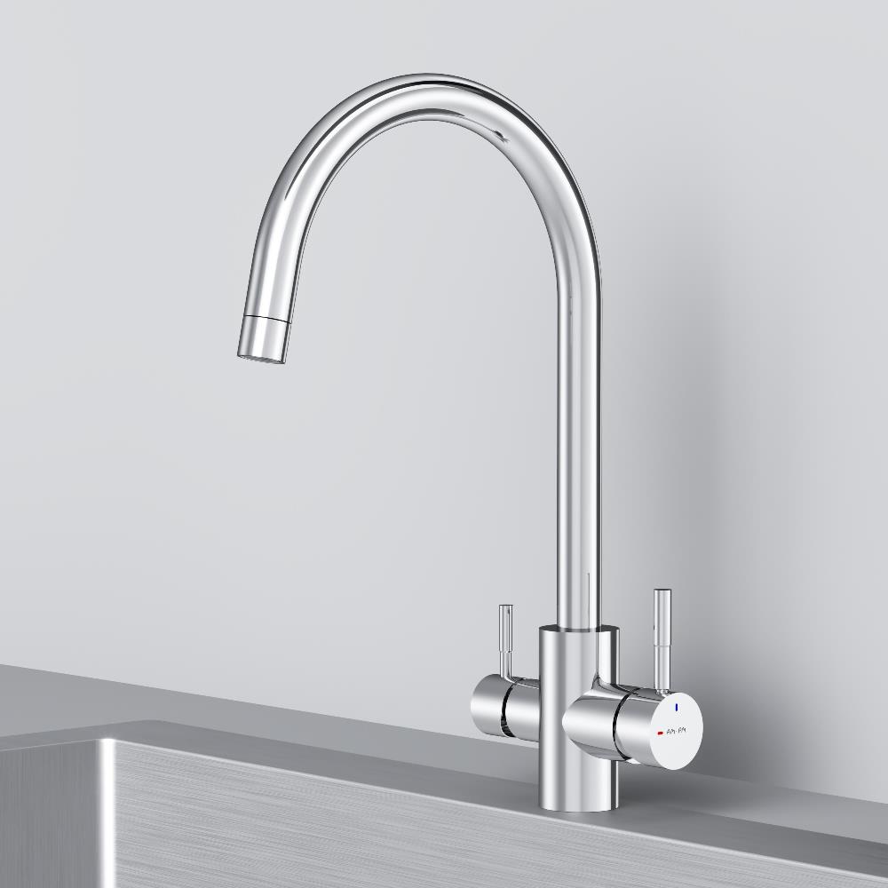 Смеситель оснащен встроенным каналом для питьевой воды. Для получения питьевой воды воспользуйтесь ручкой расположенной с левой стороны корпуса для получения обычной воды просто управляйте смесителем привычным способом.