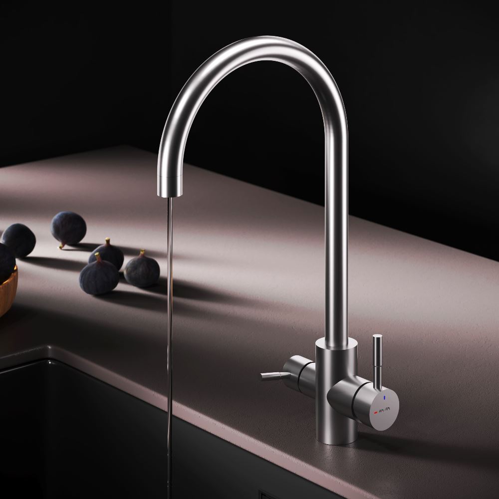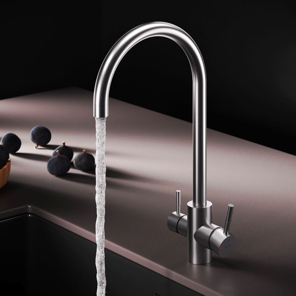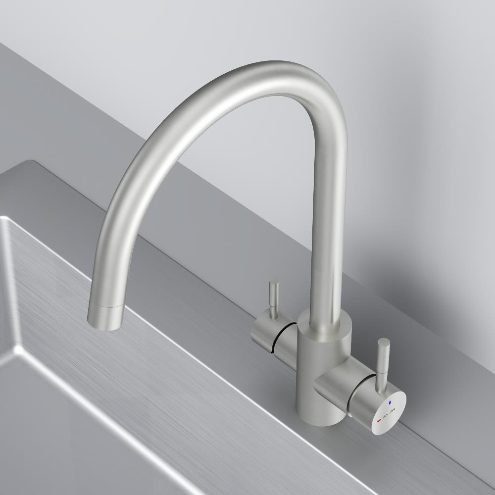 Смеситель оснащен встроенным каналом для питьевой воды. Для получения питьевой воды воспользуйтесь ручкой расположенной с левой стороны корпуса для получения обычной воды просто управляйте смесителем привычным способом.