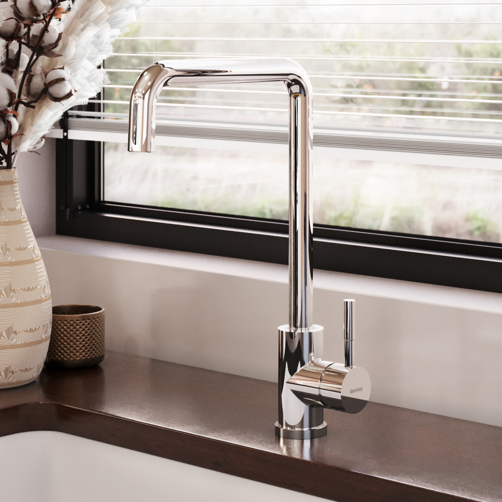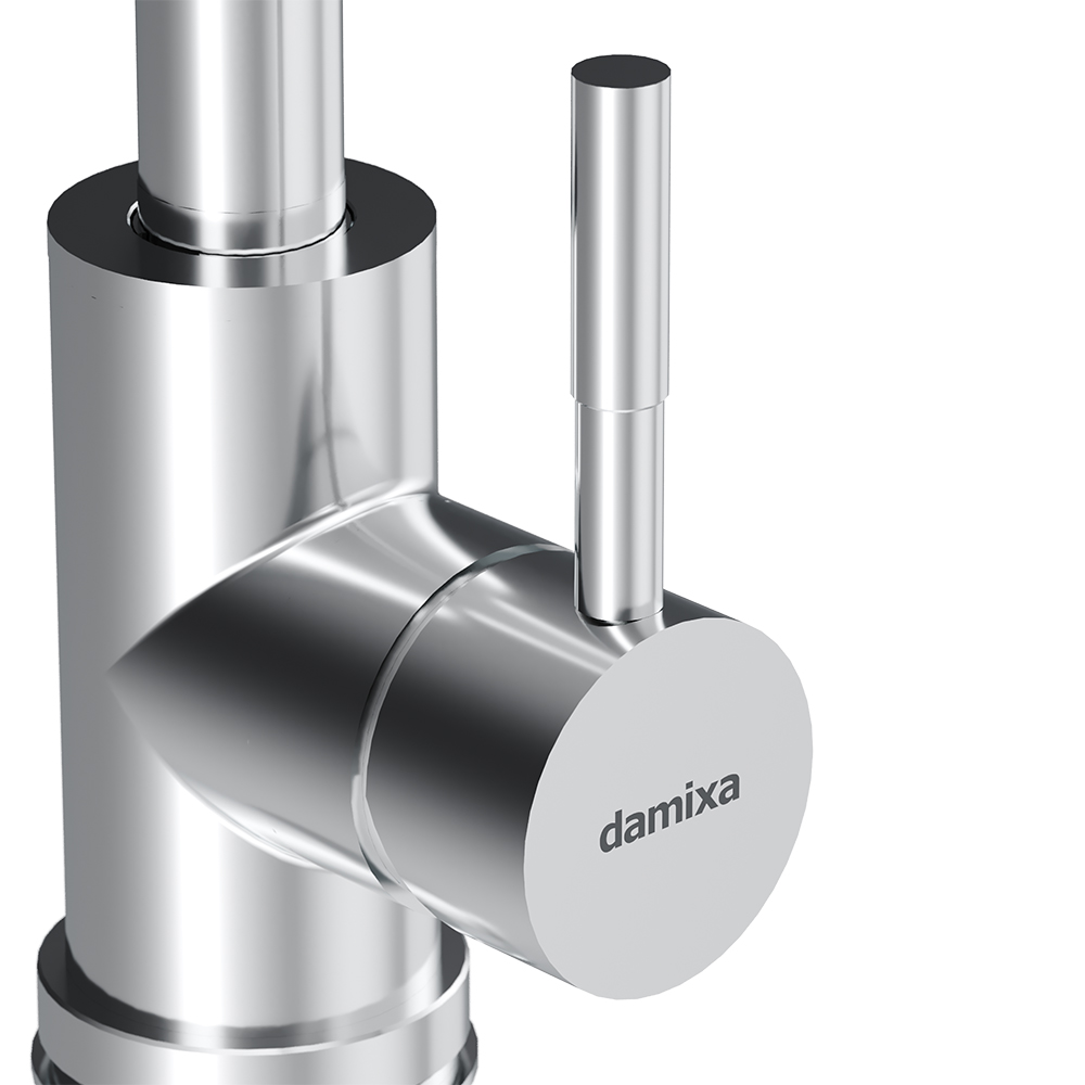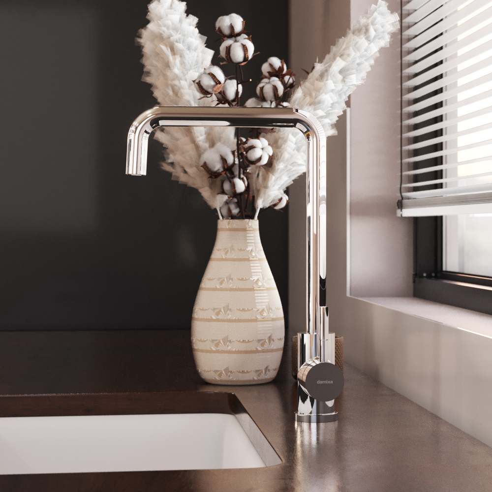 Кухонный смеситель Damixa коллекции Merkur со встроенным каналом для питьевой воды успешно совмещает в себе две функции. Благодаря прогрессивной технологии при вращении ручки на 90 градусов вы можете наслаждаться чистой водой из фильтра. Если же Вам нужна обычная вода смеситель управляется привычным способом. Также конструкция совмещающая в себе 2 в 1 экономит место и придаёт кухне опрятный вид без лишних элементов.