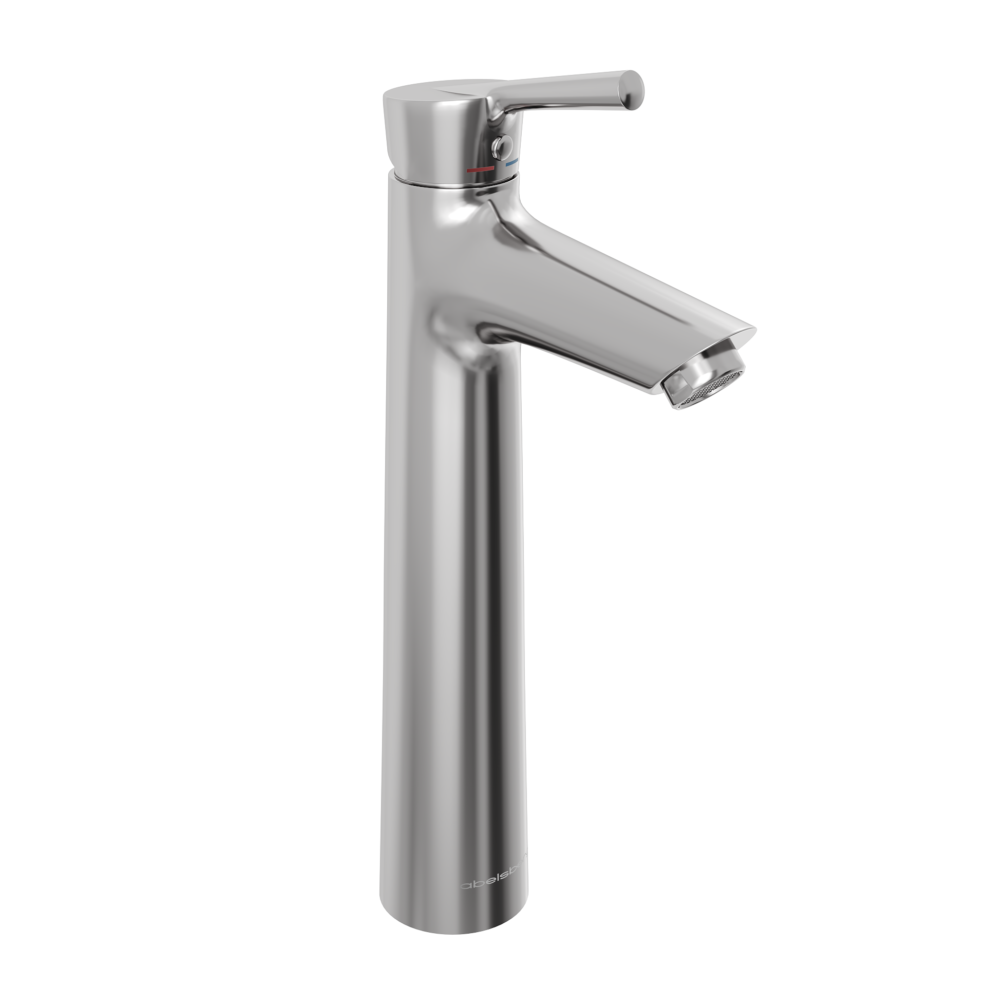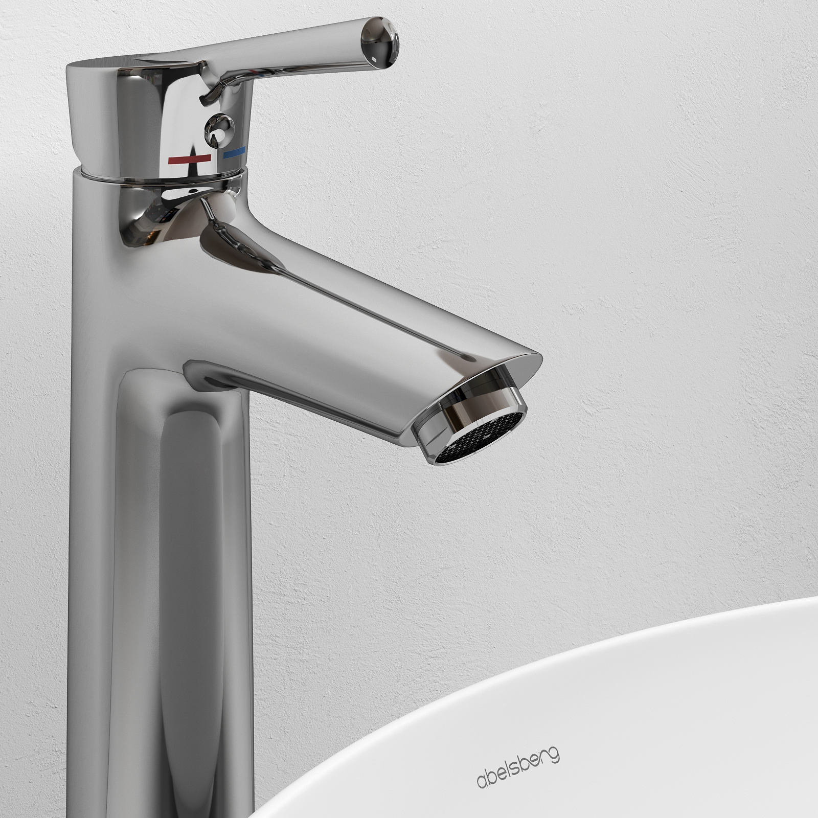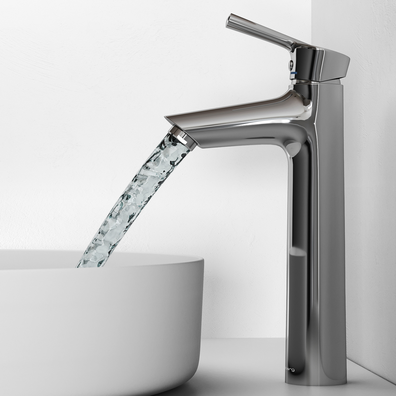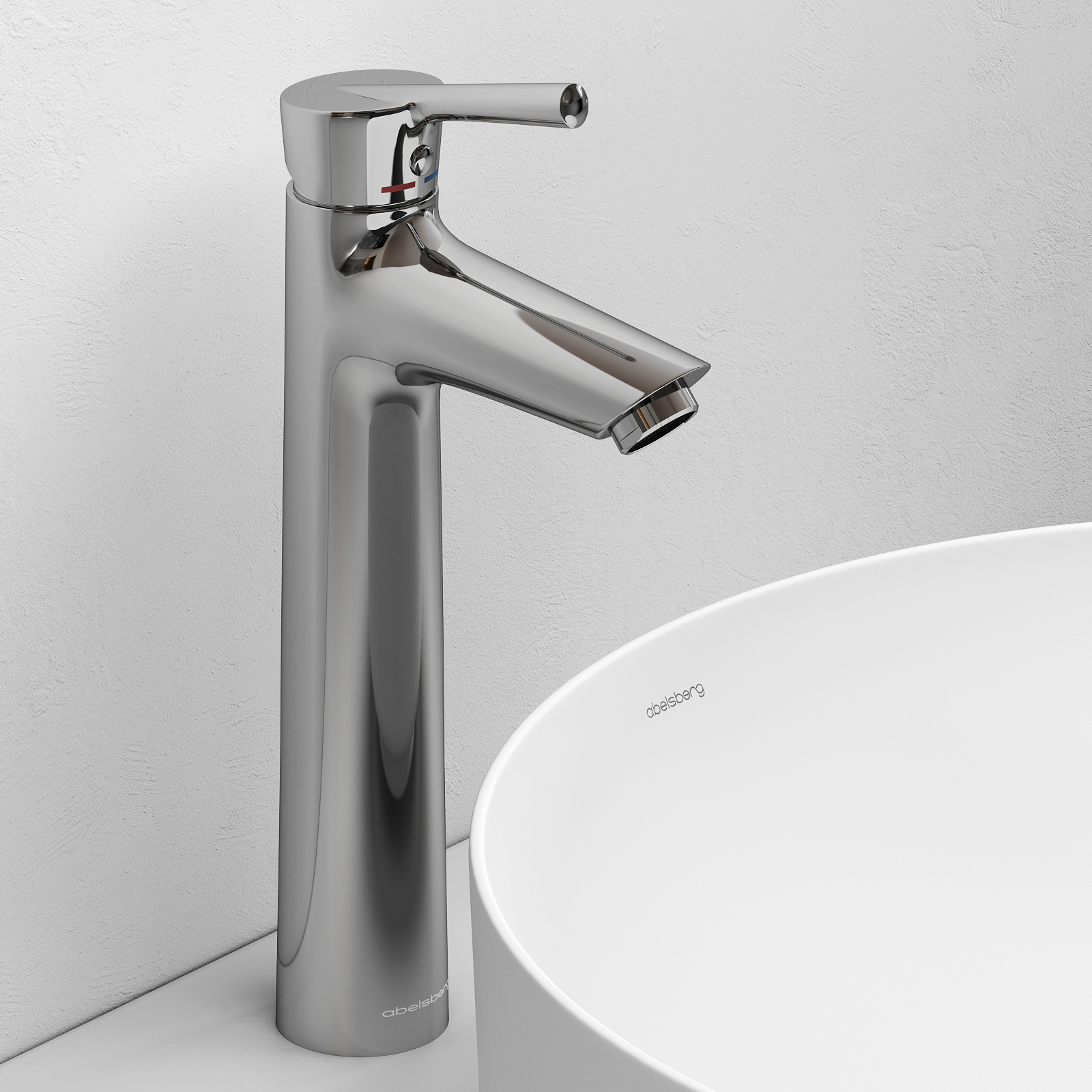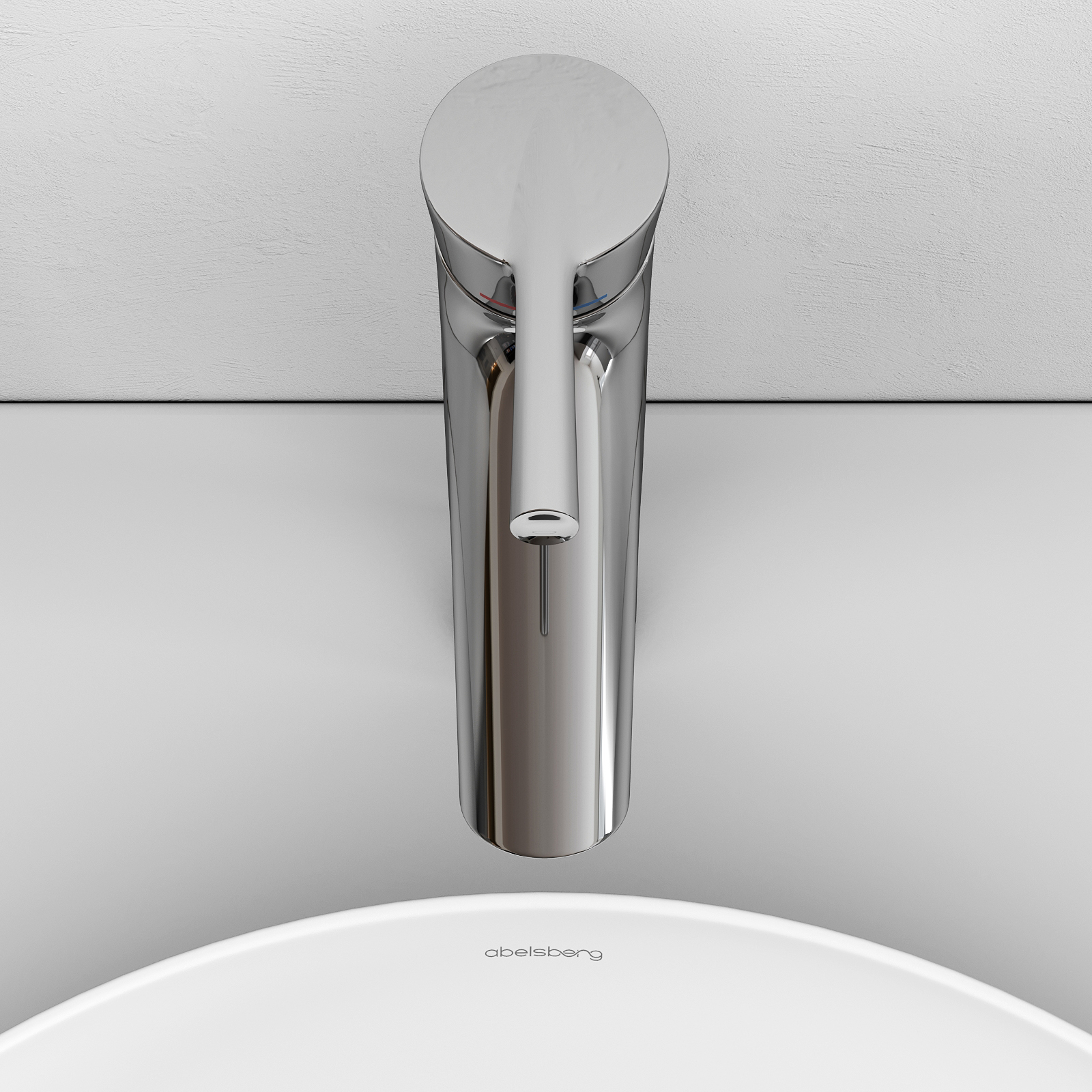 Смеситель Abelsberg Solida в высокой версии подчёркивает архитектурную выразительность коллекции. Удлинённый корпус и чёткая геометрия создают ощущение монументальности — идеальный выбор для ванных с раковинами-чашами и современными интерьерными решениями.