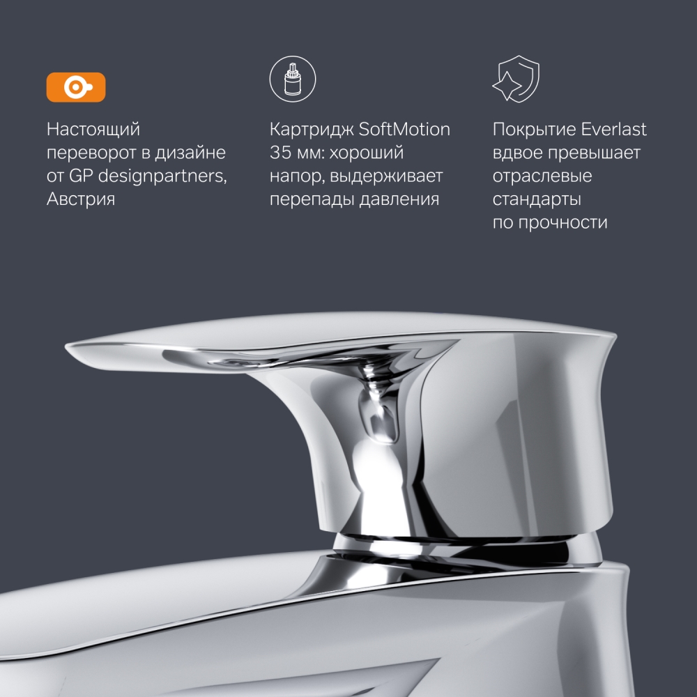 Эргономичность: безупречно продуманная форма ручки идеально ложится в ладонь. Наклон и плавный изгиб корпуса смесителя обеспечивают удобство использования на высокой раковине.