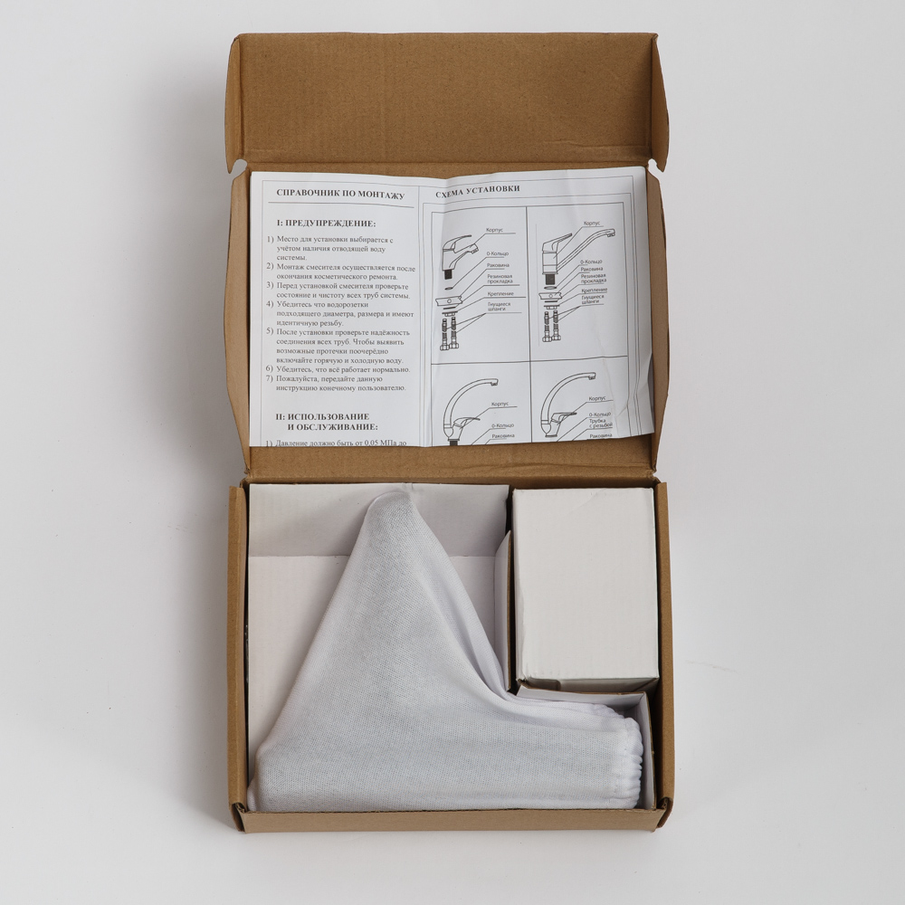 Комплект поставки: смеситель, аэратор, крепления, гибкая подводка.