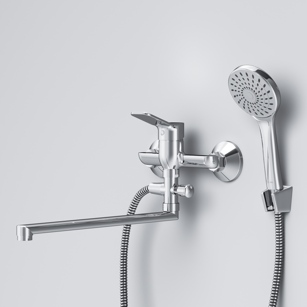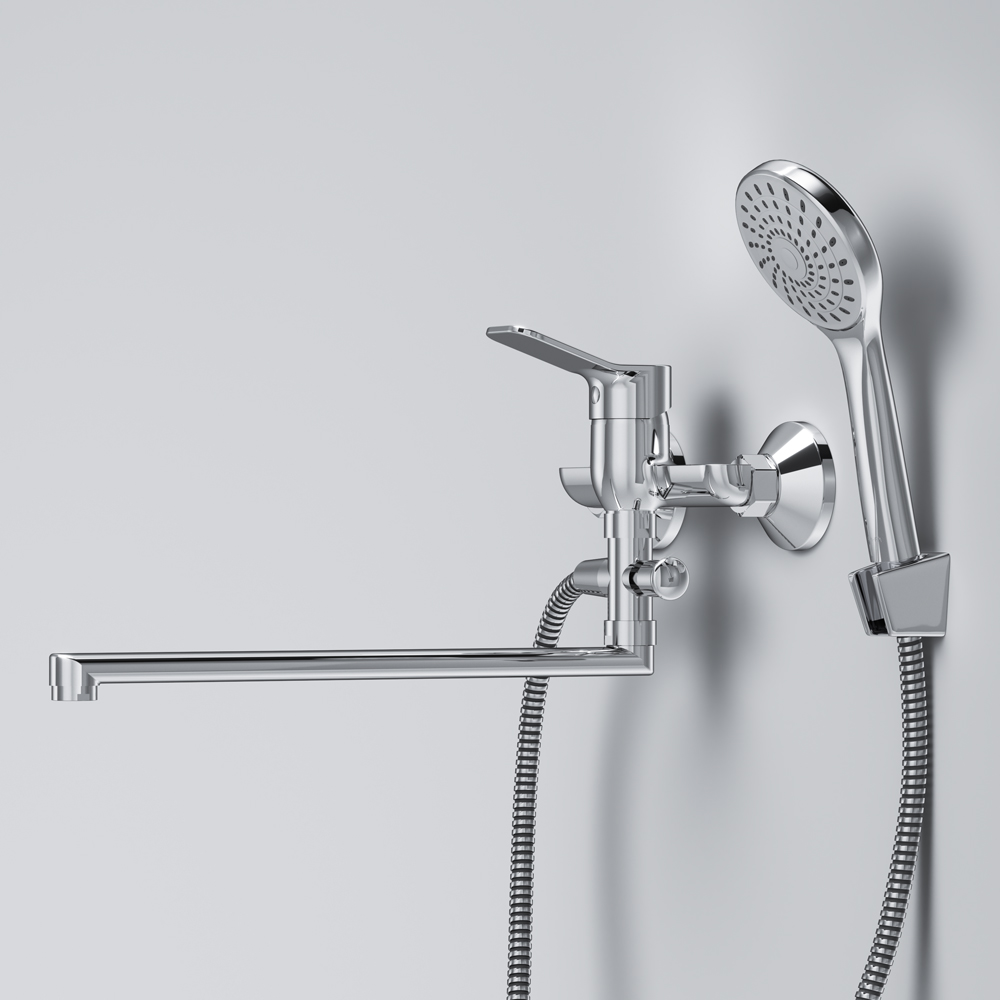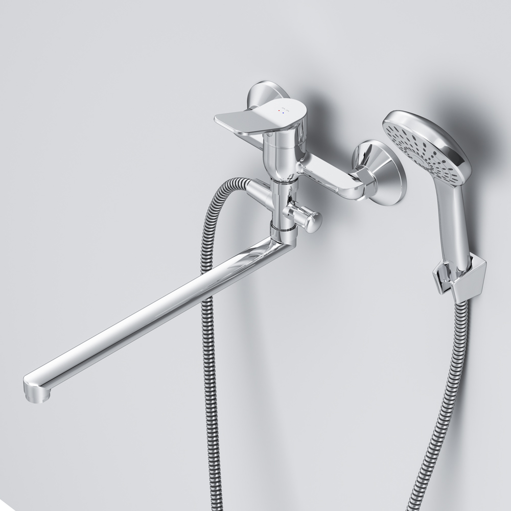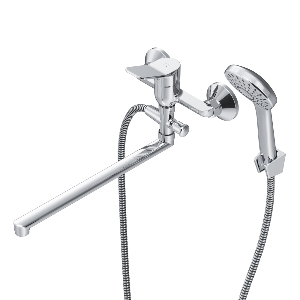 Стильное универсальное решение для ванной комнаты - качественный смеситель для ванны и душа с длинным поворотным изливом с душевым набором.