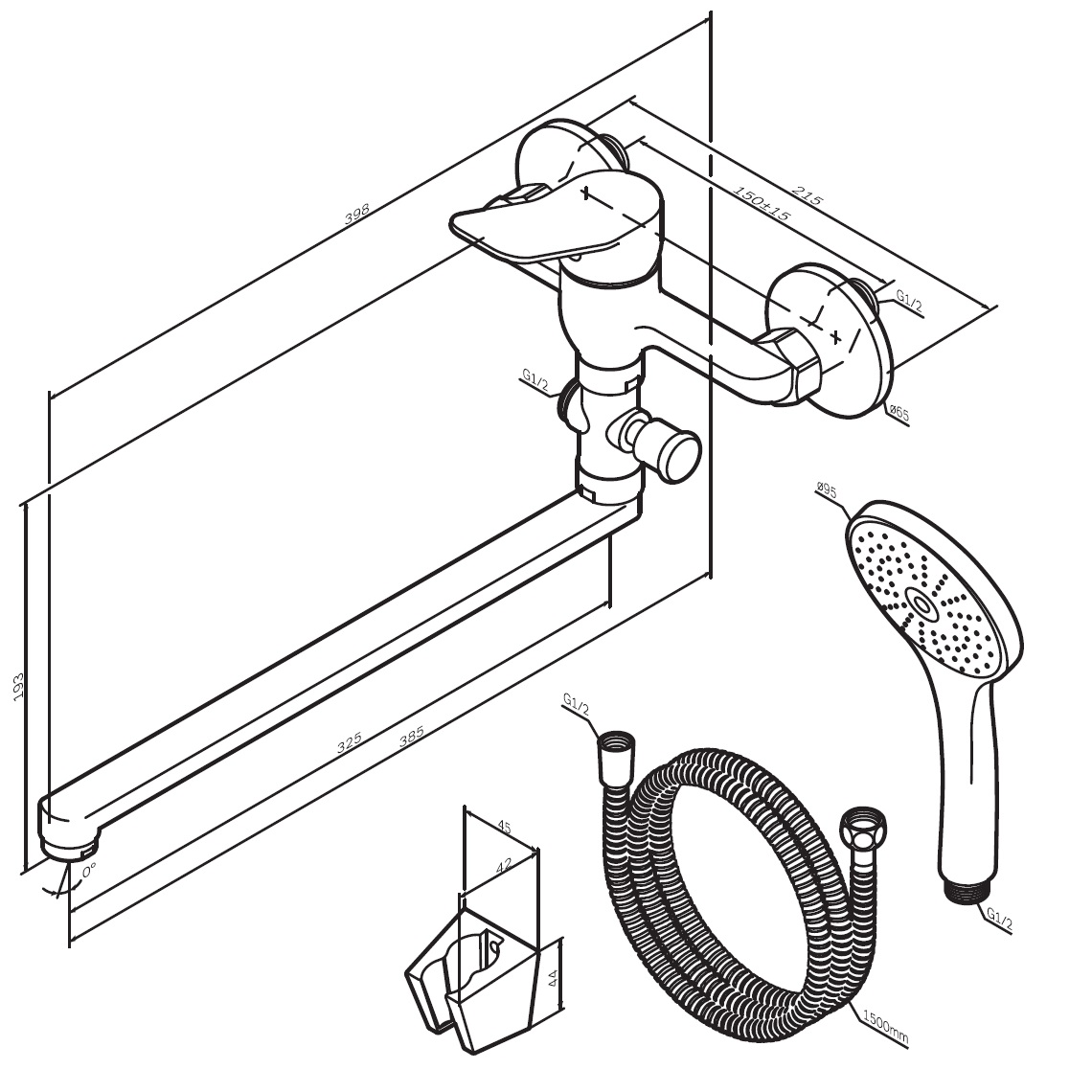 Универсальный длинный излив позволяет использовать смеситель как для ванны так и для рядом стоящей раковины. Функциональный держатель для ручного душа на два положения добавит удобства использования.